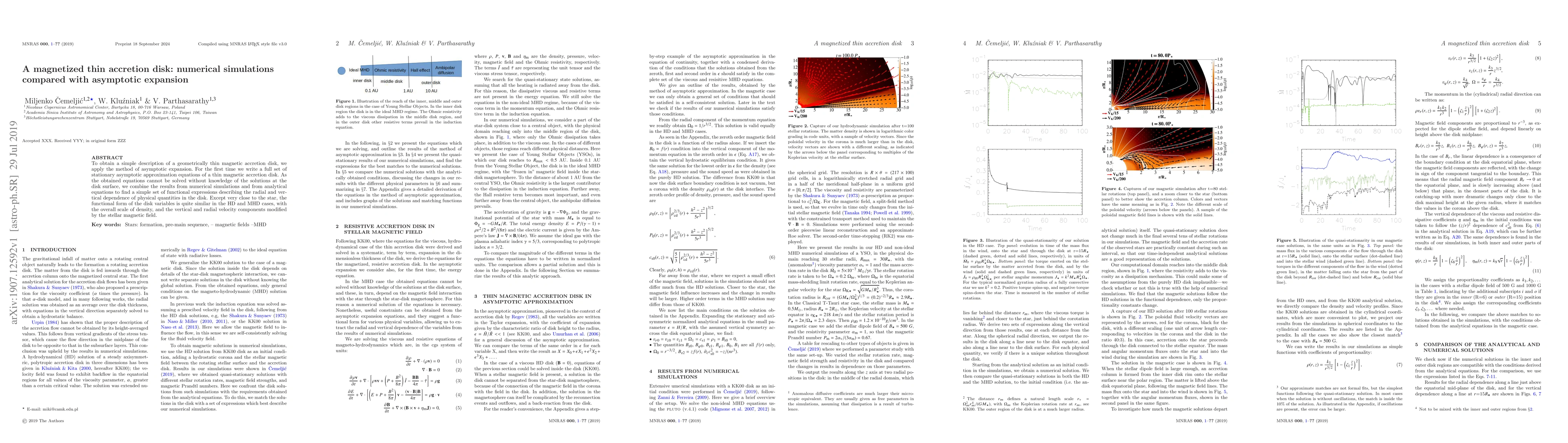 To obtain a simple description of a geometrically thin magnetic accretion disk, we apply the method of asymptotic expansion. For the first time we write a full set of stationary asymptotic approximation equations of a thin magnetic accretion disk. As the obtained equations cannot be solved without knowledge of the solutions at the disk surface, we combine the results from numerical simulations and from analytical equations to find a simple set of functional expressions describing the radial and vertical dependence of physical quantities in the disk. Except very close to the star, the functional form of the disk variables is quite similar in the HD and MHD cases, with the overall scale of density, and the vertical and radial velocity components modified by the stellar magnetic field.