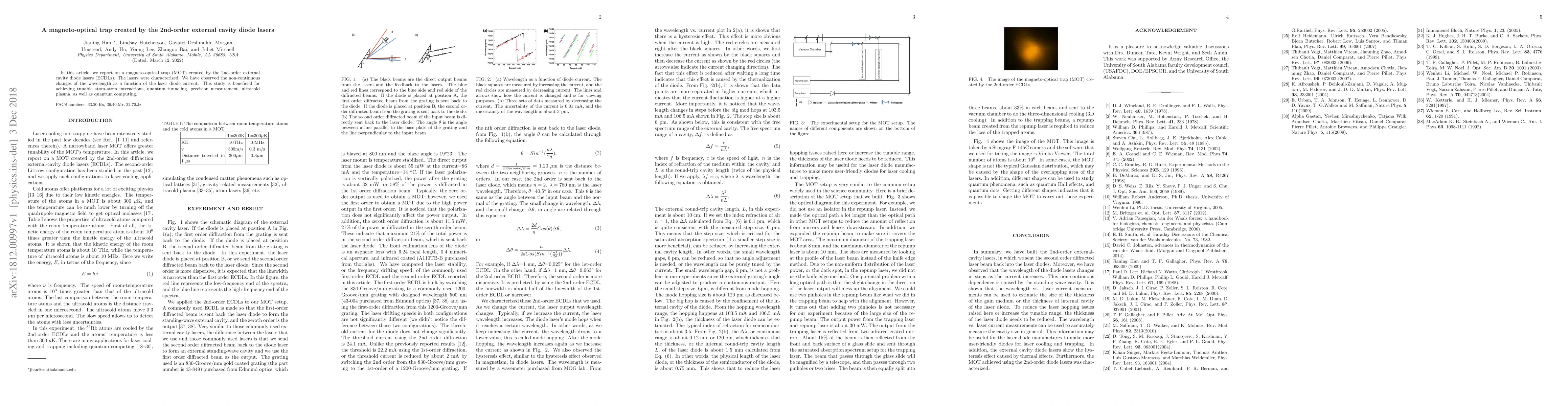 Summary: This research reports the creation of a magneto-optical trap using 2nd-order external cavity diode lasers (ECDLs), with focus on characterizing the tunable wavelength changes. The study facilitates advancements in atom-atom interactions, quantum tunneling, precision measurement, ultracold plasma, and quantum computing.