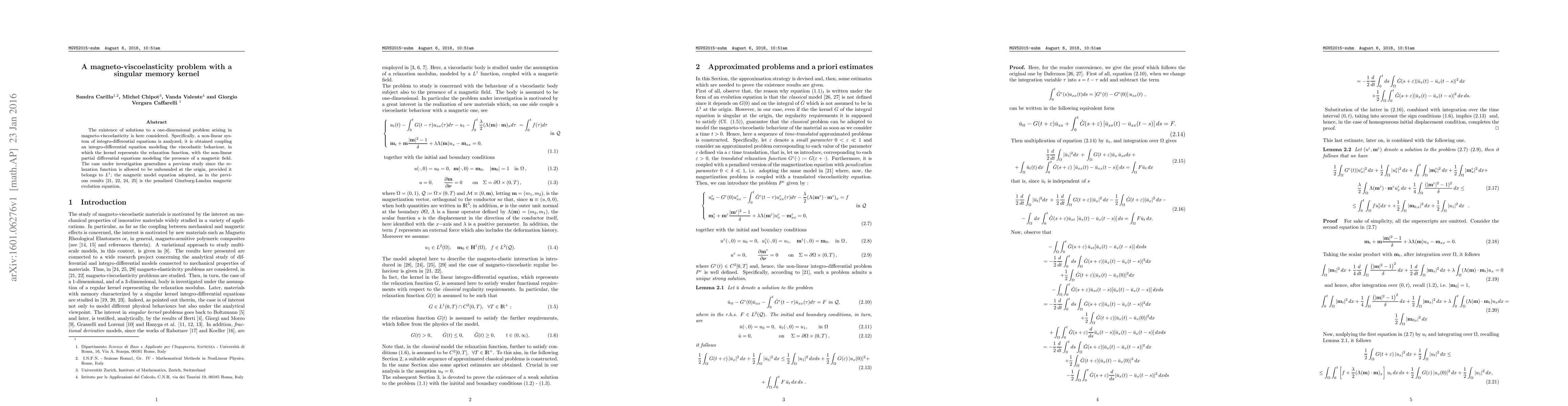 The existence of solutions to a one-dimensional problem arising in magneto-viscoelasticity is here considered. Specifically, a non-linear system of integro-differential equations is analyzed, it is obtained coupling an integro-differential equation modeling the viscoelastic behaviour, in which the kernel represents the relaxation function, with the non-linear partial differential equations modeling the presence of a magnetic field. The case under investigation generalizes a previous study since the relaxation function is allowed to be unbounded at the origin, provided it belongs to $L^1$; the magnetic model equation adopted, as in the previous results [21,22, 24, 25] is the penalized Ginzburg-Landau magnetic evolution equation.