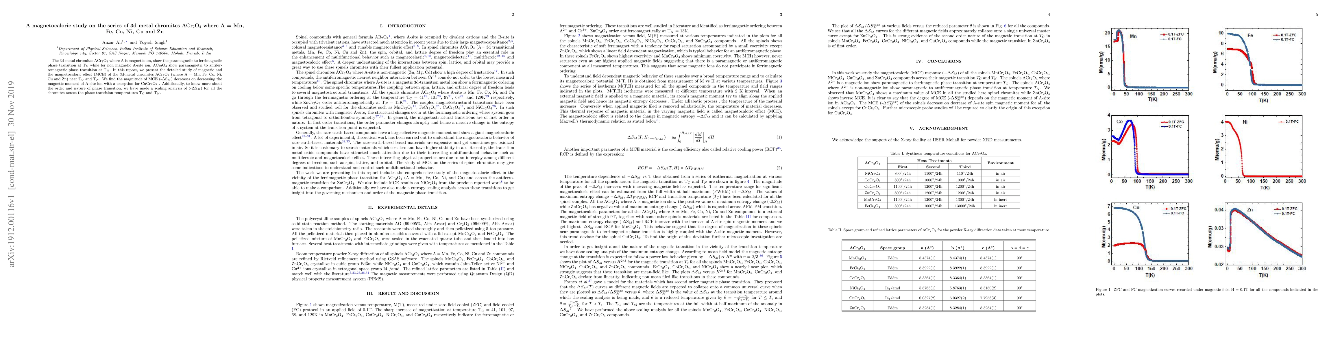 This study investigates the magnetic and magnetocaloric effects in 3d-metal chromites ACr$_2$O$_4$ (A = Mn, Fe, Co, Ni, Cu, Zn), finding that the magnetocaloric effect magnitude decreases with decreasing A-site magnetic moment, except for CuCr$_2$O$_4$. A scaling analysis reveals insights into the order and nature of phase transitions near T$_C$ and T$_N$.