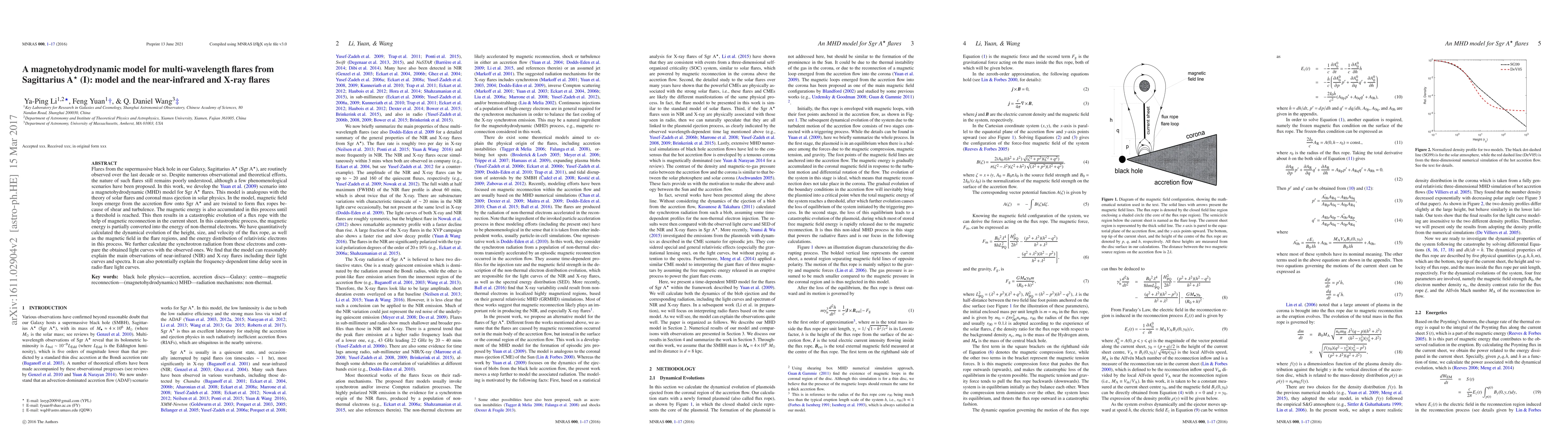 This paper develops a magnetohydrodynamic (MHD) model to explain flares from Sagittarius~A$^\star$, analogous to solar flares, where magnetic field loops accumulate energy until a catastrophic reconnection event releases non-thermal electrons, producing near-infrared and X-ray flares. The model successfully matches observed light curves and spectra of these flares.