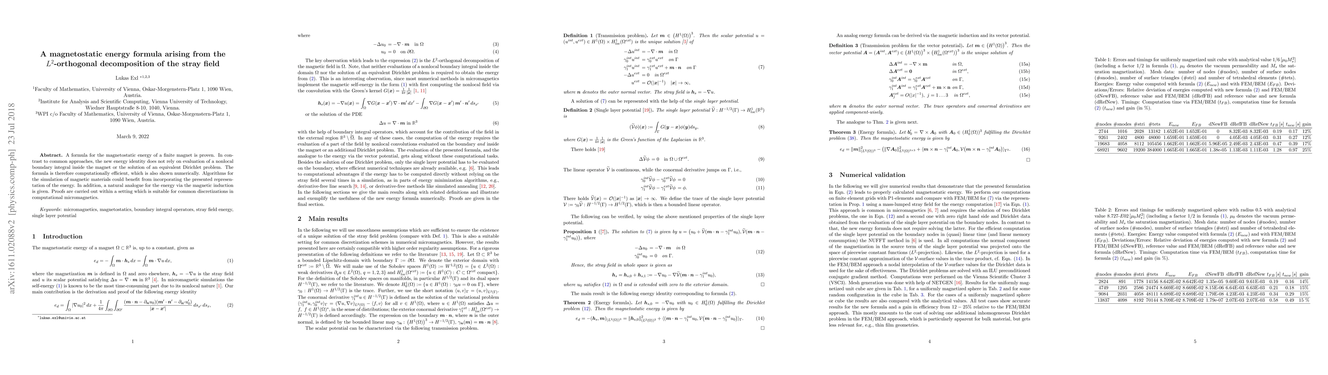 A formula for the magnetostatic energy of a finite magnet is proven. In contrast to common approaches, the new energy identity does not rely on evaluation of a nonlocal boundary integral inside the magnet or the solution of an equivalent Dirichlet problem. The formula is therefore computationally efficient, which is also shown numerically. Algorithms for the simulation of magnetic materials could benefit from incorporating the presented representation of the energy. In addition, a natural analogue for the energy via the magnetic induction is given. Proofs are carried out within a setting which is suitable for common discretizations in computational micromagnetics.