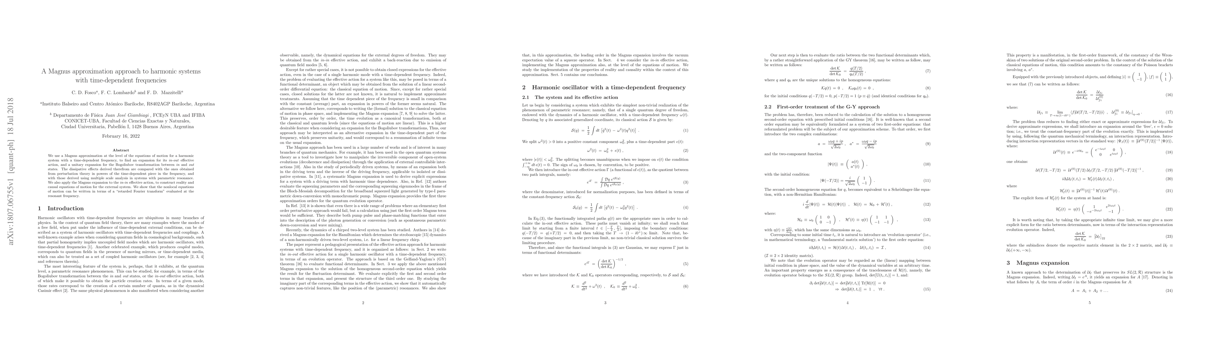 We use a Magnus approximation at the level of the equations of motion for a harmonic system with a time-dependent frequency, to find an expansion for its in-out effective action, and a unitary expansion for the Bogoliubov transformation between in and out states. The dissipative effects derived therefrom are compared with the ones obtained from perturbation theory in powers of the time-dependent piece in the frequency, and with those derived using multiple scale analysis in systems with parametric resonance. We also apply the Magnus expansion to the in-in effective action, to construct reality and causal equations of motion for the external system. We show that the nonlocal equations of motion can be written in terms of a "retarded Fourier transform" evaluated at the resonant frequency.