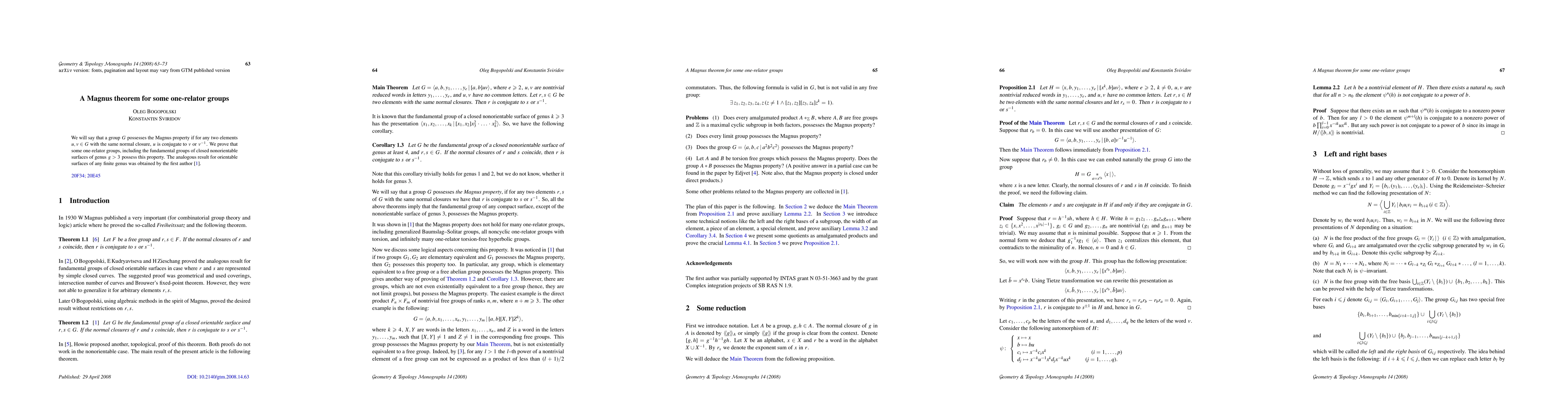 We will say that a group G possesses the Magnus property if for any two elements u,v in G with the same normal closure, u is conjugate to v or v^{-1}. We prove that some one-relator groups, including the fundamental groups of closed nonorientable surfaces of genus g>3 possess this property. The analogous result for orientable surfaces of any finite genus was obtained by the first author [Geometric methods in group theory, Contemp. Math, 372 (2005) 59-69].