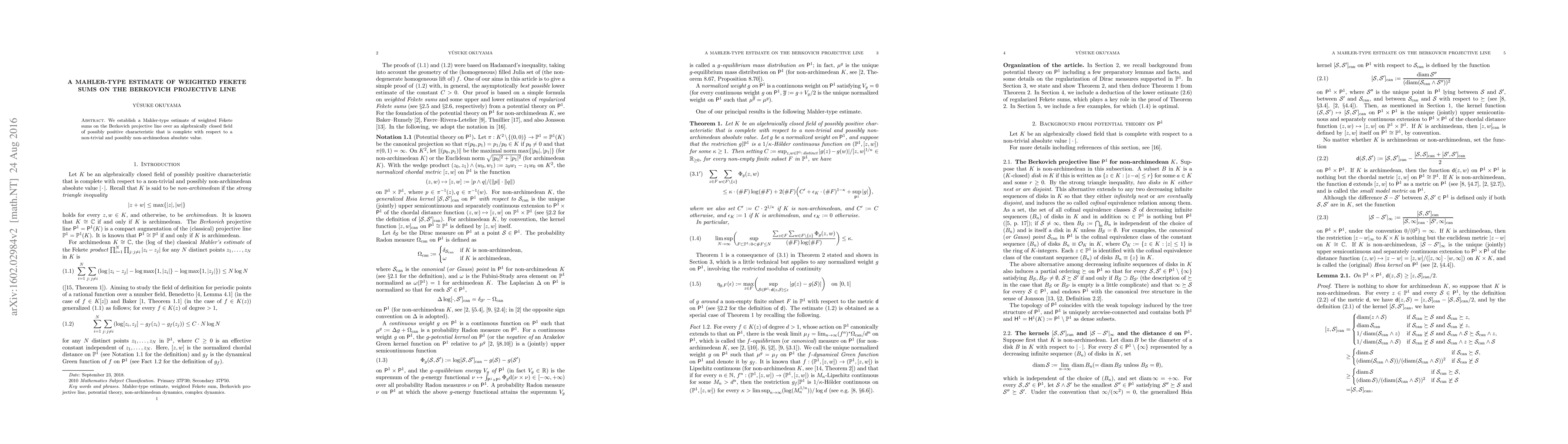We establish a Mahler-type estimate of weighted Fekete sums on the Berkovich projective line over an algebraically closed field of possibly positive characteristic that is complete with respect to a non-trivial and possibly non-archimedean absolute value.