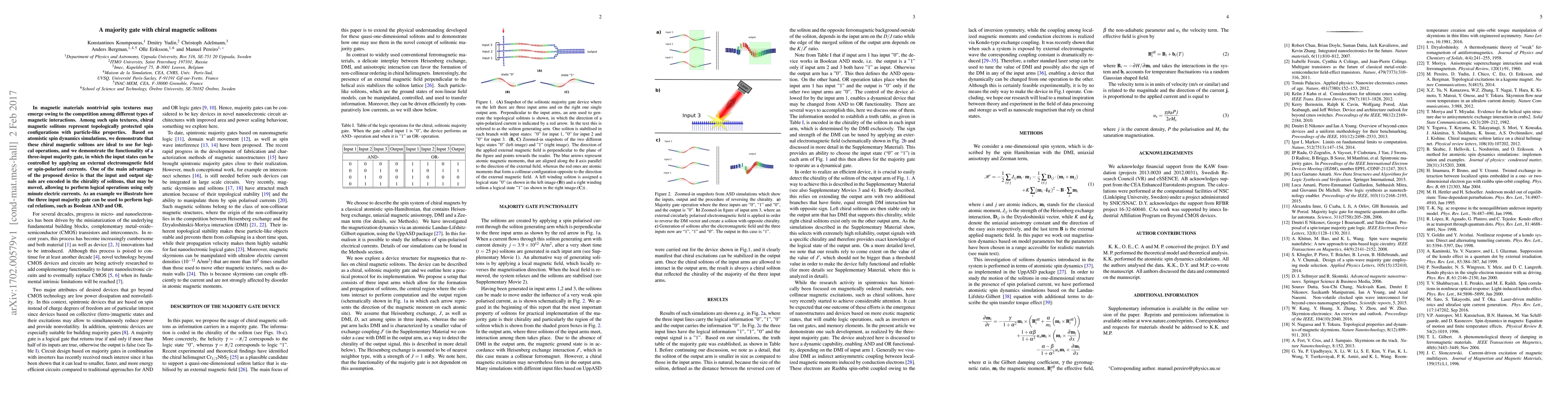 In magnetic materials nontrivial spin textures may emerge owing to the competition among different types of magnetic interactions. Among such spin textures, chiral magnetic solitons represent topologically protected spin configurations with particle-like properties. Based on atomistic spin dynamics simulations, we demonstrate that these chiral magnetic solitons are ideal to use for logical operations, and we demonstrate the functionality of a three-input majority gate, in which the input states can be controlled by applying an external electromagnetic field or spin-polarized currents. One of the main advantages of the proposed device is that the input and output signals are encoded in the chirality of solitons, that may be moved, allowing to perform logical operations using only minute electric currents. As an example we illustrate how the three input majority gate can be used to perform logical relations, such as Boolean AND and OR.