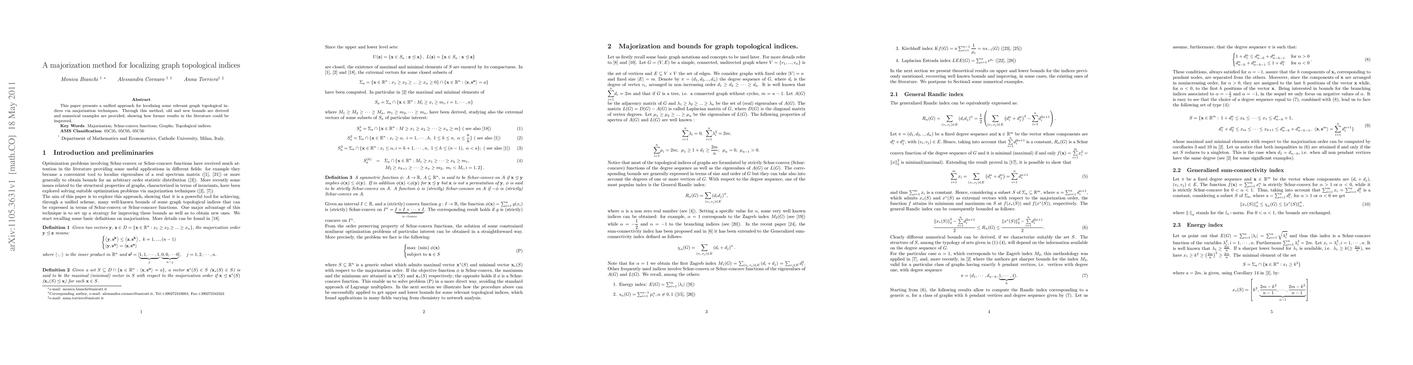 This paper introduces a majorization method to localize graph topological indices, deriving improved bounds and providing numerical examples that enhance previous results in the literature.