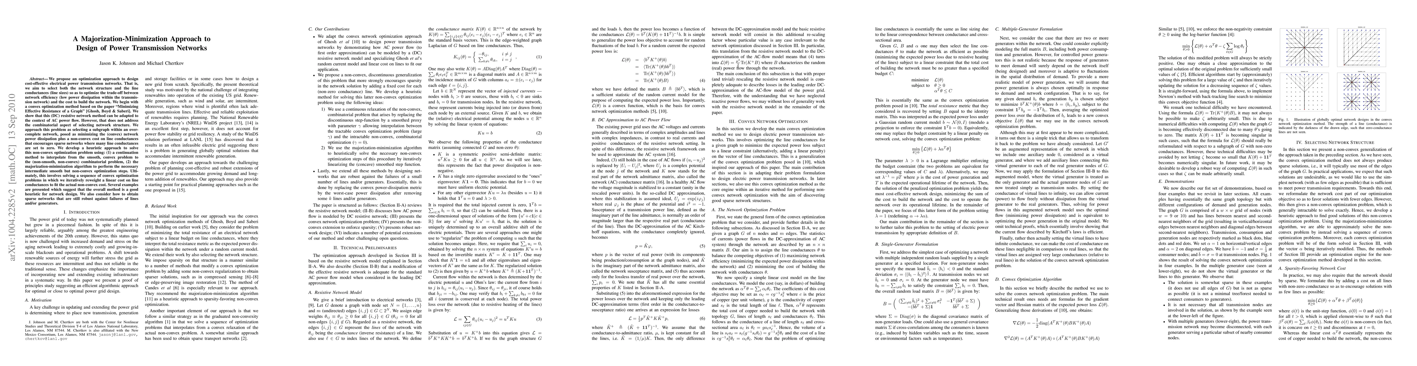 We propose an optimization approach to design cost-effective electrical power transmission networks. That is, we aim to select both the network structure and the line conductances (line sizes) so as to optimize the trade-off between network efficiency (low power dissipation within the transmission network) and the cost to build the network. We begin with a convex optimization method based on the paper ``Minimizing Effective Resistance of a Graph'' [Ghosh, Boyd \& Saberi]. We show that this (DC) resistive network method can be adapted to the context of AC power flow. However, that does not address the combinatorial aspect of selecting network structure. We approach this problem as selecting a subgraph within an over-complete network, posed as minimizing the (convex) network power dissipation plus a non-convex cost on line conductances that encourages sparse networks where many line conductances are set to zero. We develop a heuristic approach to solve this non-convex optimization problem using: (1) a continuation method to interpolate from the smooth, convex problem to the (non-smooth, non-convex) combinatorial problem, (2) the majorization-minimization algorithm to perform the necessary intermediate smooth but non-convex optimization steps. Ultimately, this involves solving a sequence of convex optimization problems in which we iteratively reweight a linear cost on line conductances to fit the actual non-convex cost. Several examples are presented which suggest that the overall method is a good heuristic for network design. We also consider how to obtain sparse networks that are still robust against failures of lines and/or generators.