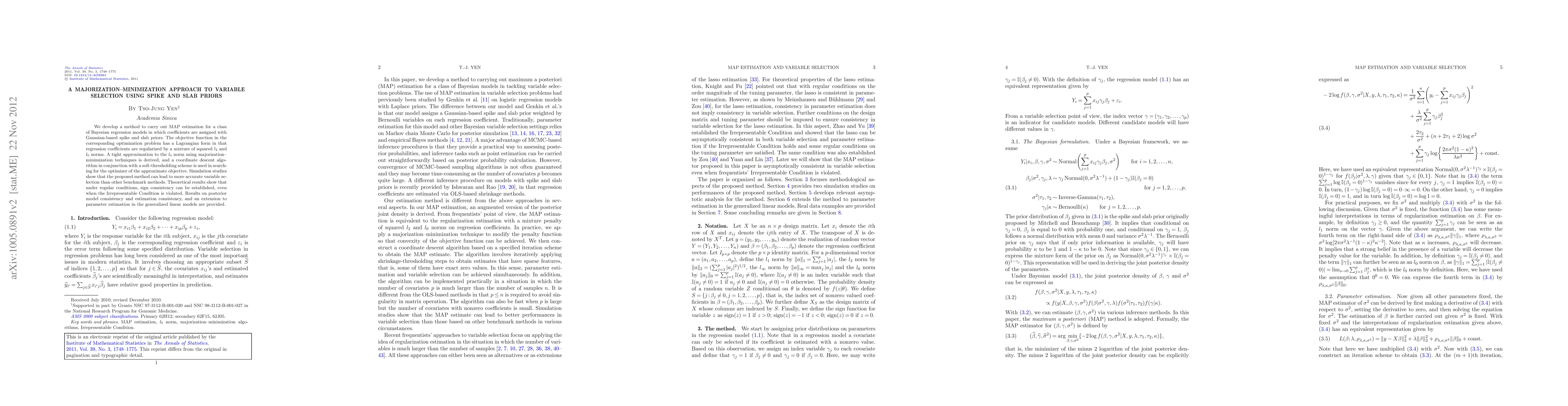 We develop a method to carry out MAP estimation for a class of Bayesian regression models in which coefficients are assigned with Gaussian-based spike and slab priors. The objective function in the corresponding optimization problem has a Lagrangian form in that regression coefficients are regularized by a mixture of squared $l_2$ and $l_0$ norms. A tight approximation to the $l_0$ norm using majorization-minimization techniques is derived, and a coordinate descent algorithm in conjunction with a soft-thresholding scheme is used in searching for the optimizer of the approximate objective. Simulation studies show that the proposed method can lead to more accurate variable selection than other benchmark methods. Theoretical results show that under regular conditions, sign consistency can be established, even when the Irrepresentable Condition is violated. Results on posterior model consistency and estimation consistency, and an extension to parameter estimation in the generalized linear models are provided.