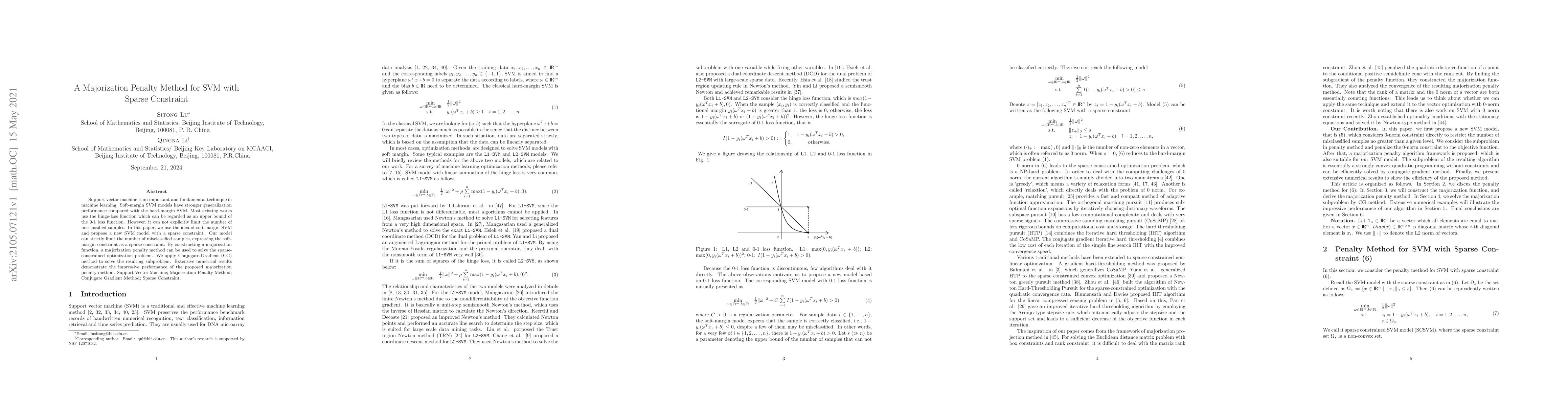 This paper proposes a new SVM model with a sparse constraint to limit the number of misclassified samples, using a majorization penalty method to solve the optimization problem. The method employs a Conjugate-Gradient approach and shows superior performance in extensive numerical experiments.