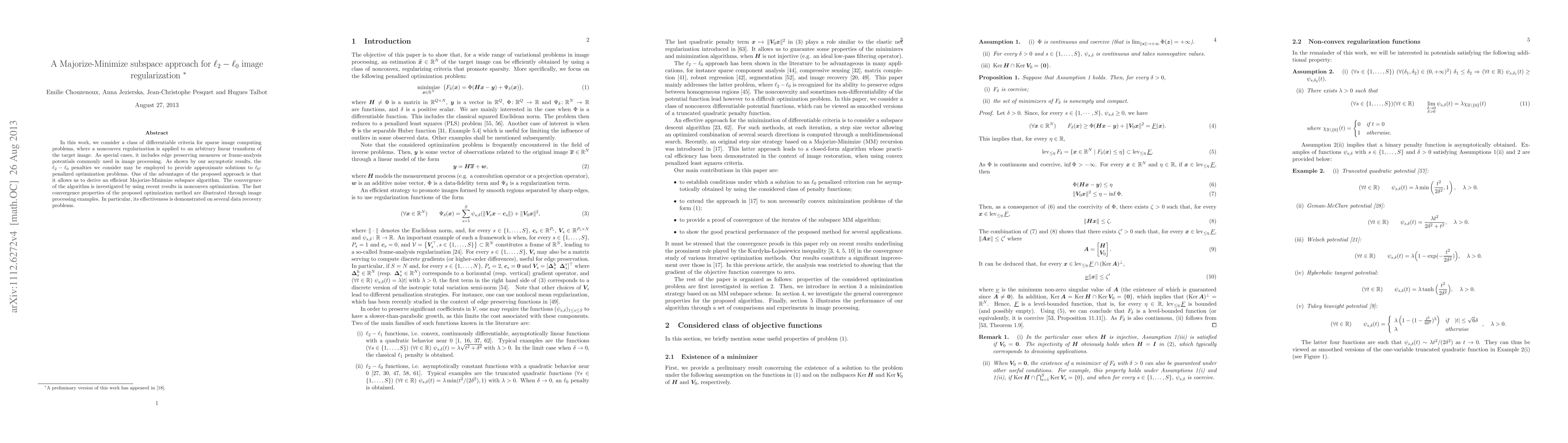 In this work, we consider a class of differentiable criteria for sparse image computing problems, where a nonconvex regularization is applied to an arbitrary linear transform of the target image. As special cases, it includes edge-preserving measures or frame-analysis potentials commonly used in image processing. As shown by our asymptotic results, the l2-l0 penalties we consider may be employed to provide approximate solutions to l0-penalized optimization problems. One of the advantages of the proposed approach is that it allows us to derive an efficient Majorize-Minimize subspace algorithm. The convergence of the algorithm is investigated by using recent results in nonconvex optimization. The fast convergence properties of the proposed optimization method are illustrated through image processing examples. In particular, its effectiveness is demonstrated on several data recovery problems.