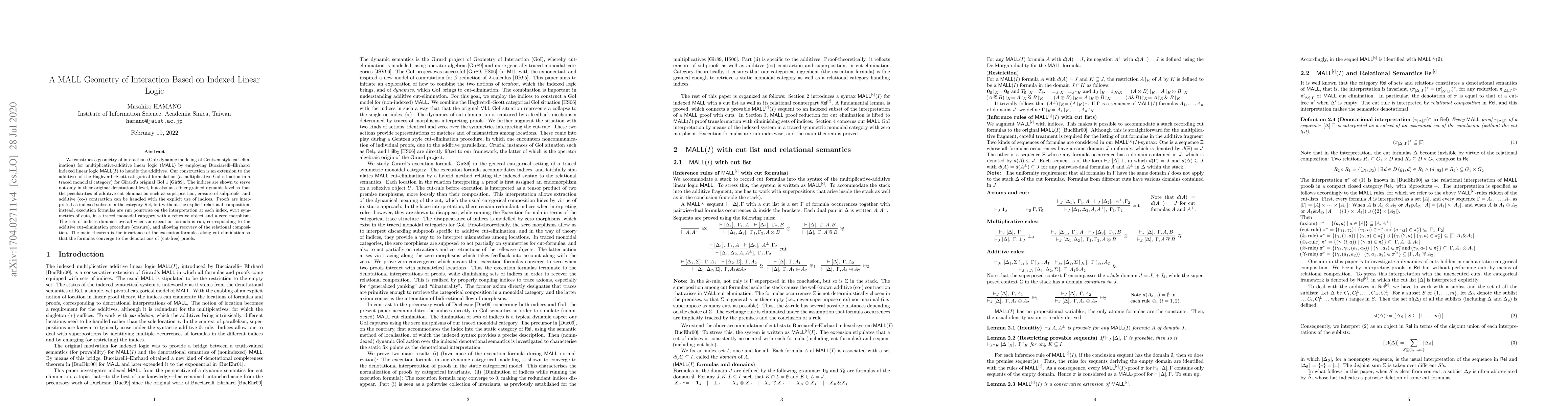 We construct a geometry of interaction (GoI: dynamic modeling of Gentzen-style cut elimination) for multiplicative-additive linear logic (MALL) by employing Bucciarelli-Ehrhard indexed linear logic MALL(I) to handle the additives. Our construction is an extension to the additives of the Haghverdi-Scott categorical formulation (a multiplicative GoI situation in a traced monoidal category) for Girard's original GoI 1. The indices are shown to serve not only in their original denotational level, but also at a finer grained dynamic level so that the peculiarities of additive cut elimination such as superposition, erasure of subproofs, and additive (co-) contraction can be handled with the explicit use of indices. Proofs are interpreted as indexed subsets in the category Rel, but without the explicit relational composition; instead, execution formulas are run pointwise on the interpretation at each index, w.r.t symmetries of cuts, in a traced monoidal category with a reflexive object and a zero morphism. The sets of indices diminish overall when an execution formula is run, corresponding to the additive cut-elimination procedure (erasure), and allowing recovery of the relational composition. The main theorem is the invariance of the execution formulas along cut elimination so that the formulas converge to the denotations of (cut-free) proofs.