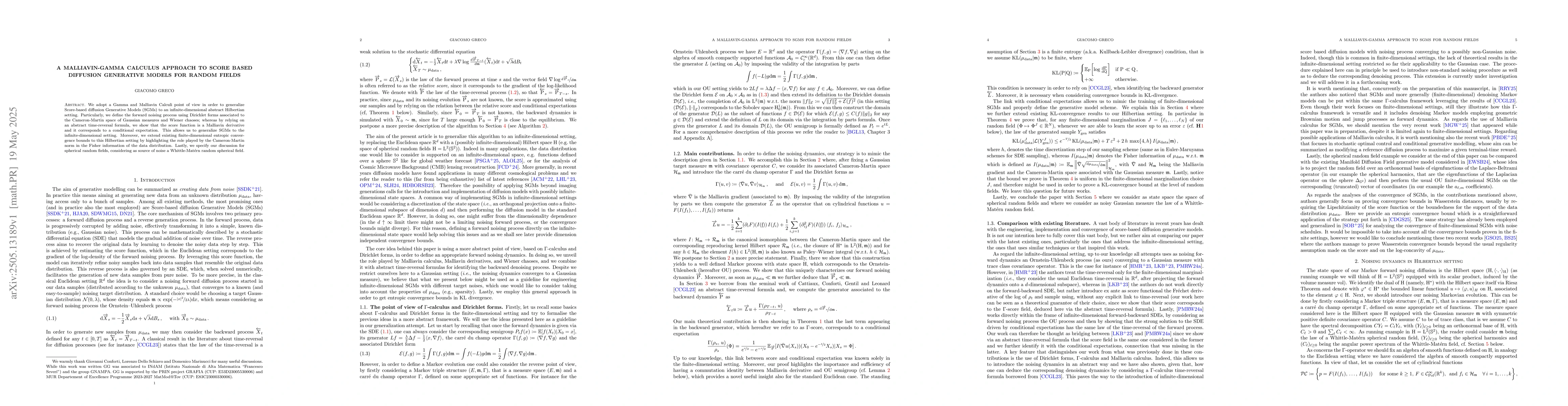 This paper generalizes Score-based diffusion Generative Models to infinite-dimensional abstract Hilbertian settings using Malliavin-Gamma calculus, enabling the modeling of random fields.