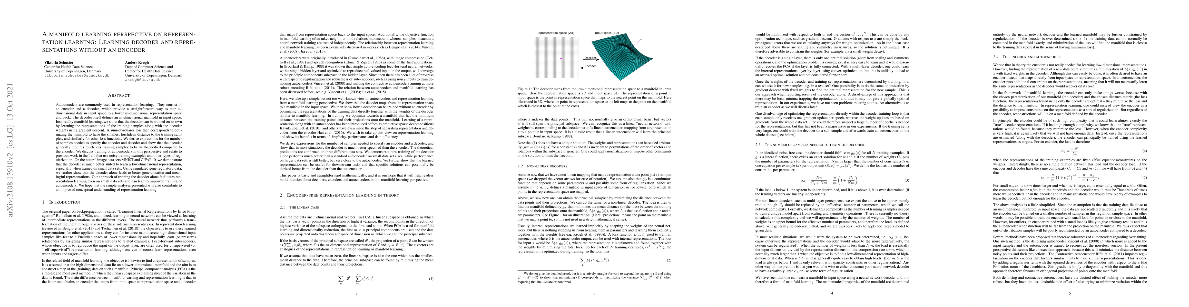 Autoencoders are commonly used in representation learning. They consist of an encoder and a decoder, which provide a straightforward way to map n-dimensional data in input space to a lower m-dimensional representation space and back. The decoder itself defines an m-dimensional manifold in input space. Inspired by manifold learning, we show that the decoder can be trained on its own by learning the representations of the training samples along with the decoder weights using gradient descent. A sum-of-squares loss then corresponds to optimizing the manifold to have the smallest Euclidean distance to the training samples, and similarly for other loss functions. We derive expressions for the number of samples needed to specify the encoder and decoder and show that the decoder generally requires much less training samples to be well-specified compared to the encoder. We discuss training of autoencoders in this perspective and relate to previous work in the field that use noisy training examples and other types of regularization. On the natural image data sets MNIST and CIFAR10, we demonstrate that the decoder is much better suited to learn a low-dimensional representation, especially when trained on small data sets. Using simulated gene regulatory data, we further show that the decoder alone leads to better generalization and meaningful representations. Our approach of training the decoder alone facilitates representation learning even on small data sets and can lead to improved training of autoencoders. We hope that the simple analyses presented will also contribute to an improved conceptual understanding of representation learning.