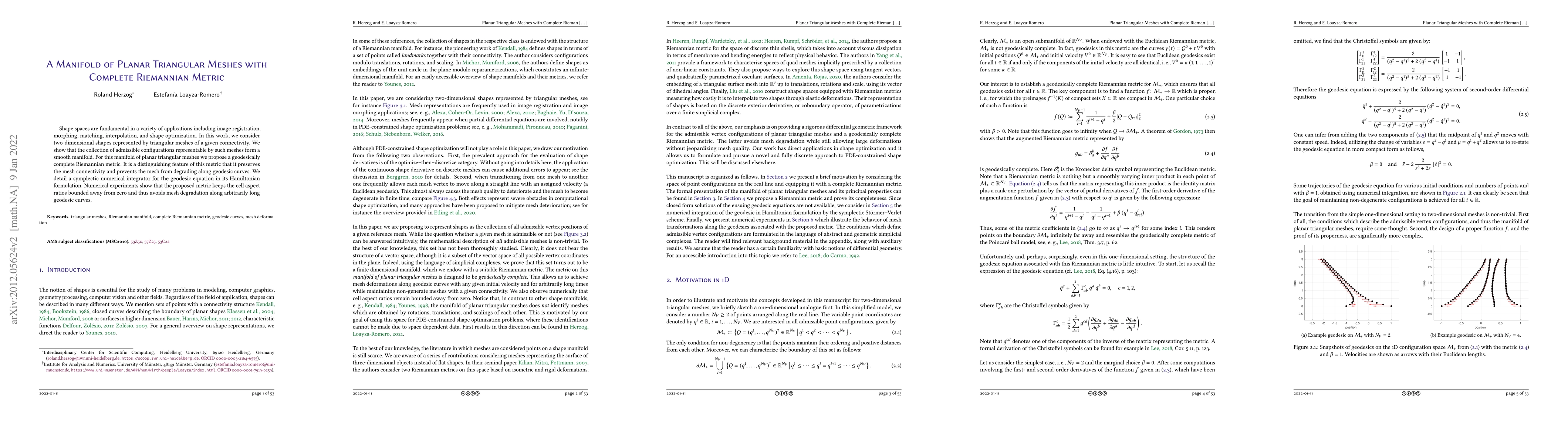 The paper presents a theoretical study on planar triangular meshes, proving that the set of admissible configurations forms a smooth manifold and proposing a geodesically complete Riemannian metric for this manifold that preserves mesh connectivity and avoids mesh degradation.