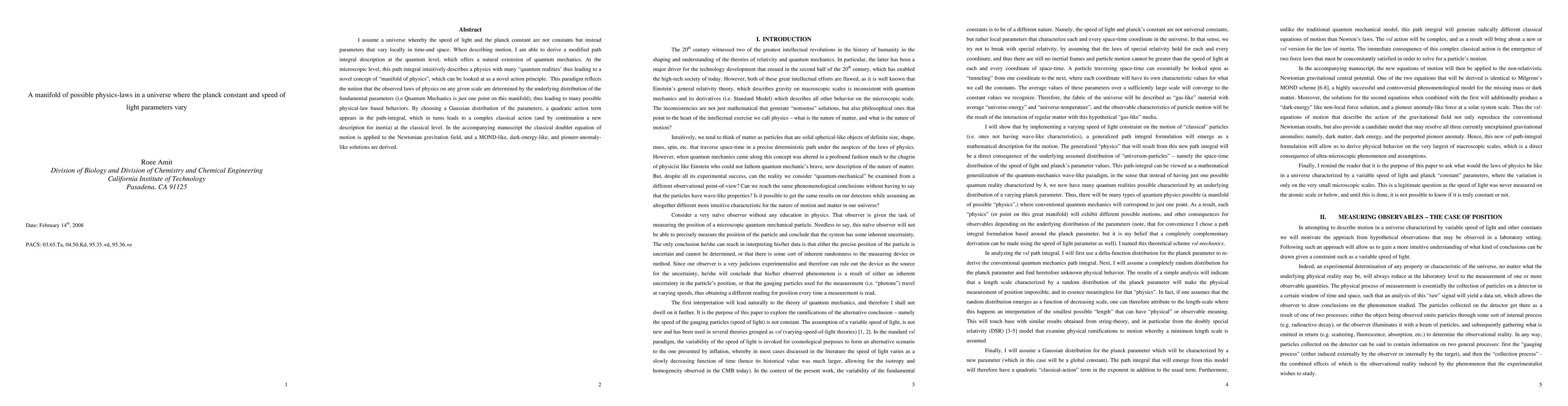 I assume a universe whereby the speed of light and the planck constant are not constants but instead parameters that vary locally in time-and space. When describing motion, I am able to derive a modified path integral description at the quantum level, which offers a natural extension of quantum mechanics. At the microscopic level, this path integral intuitively describes a physics with many quantum realities thus leading to a novel concept of manifold of physics, which can be looked at as a novel action principle. This paradigm reflects the notion that the observed laws of physics on any given scale are determined by the underlying distribution of the fundamental parameters (i.e Quantum Mechanics is just one point on this manifold), thus leading to many possible physical-law based behaviors. By choosing a Gaussian distribution of the parameters, a quadratic action term appears in the path-integral, which in turns leads to a complex classical action (and by continuation a new description for inertia) at the classical level. In the accompanying manuscript the classical doublet equation of motion is applied to the Newtonian gravitation field, and a MOND-like, dark-energy-like, and pioneer-anomaly-like solutions are derived.