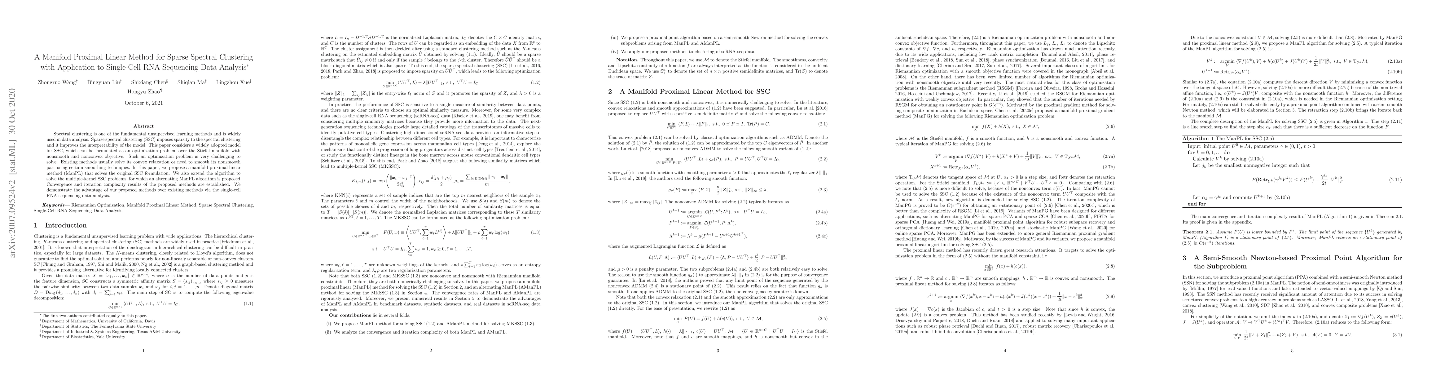 This paper proposes a manifold proximal linear method (ManPL) to solve sparse spectral clustering (SSC) formulated as an optimization problem over the Stiefel manifold. The method outperforms existing techniques, as demonstrated through its application to single-cell RNA sequencing data analysis.