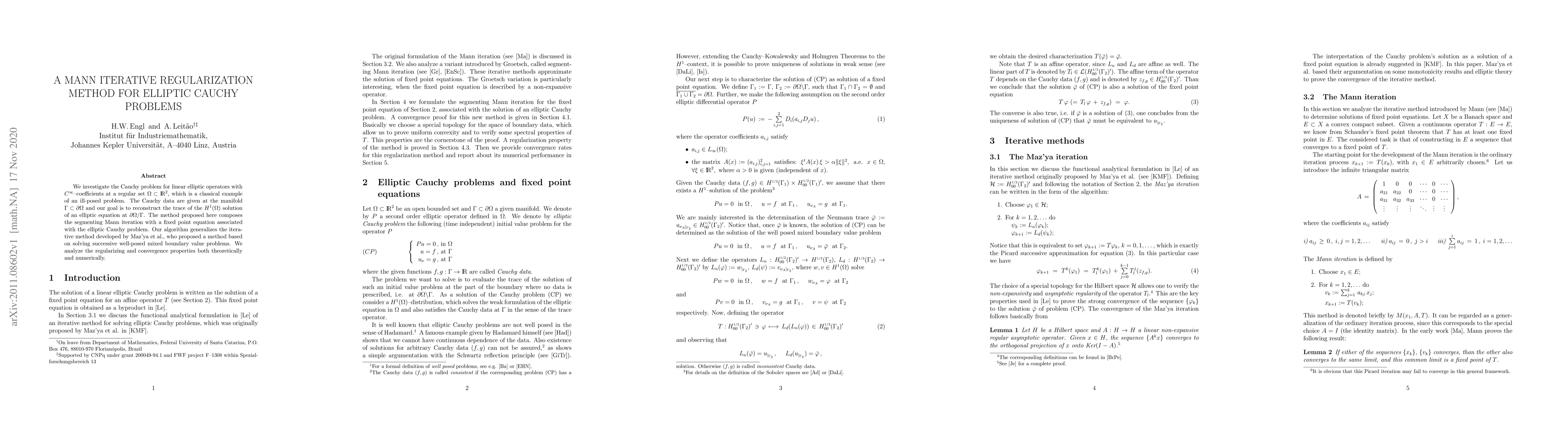 This paper proposes a Mann iterative regularization method to solve the ill-posed Cauchy problem for linear elliptic operators with smooth coefficients. The method combines Mann iteration with a fixed-point equation and generalizes previous iterative approaches, demonstrating both theoretical and numerical convergence properties.