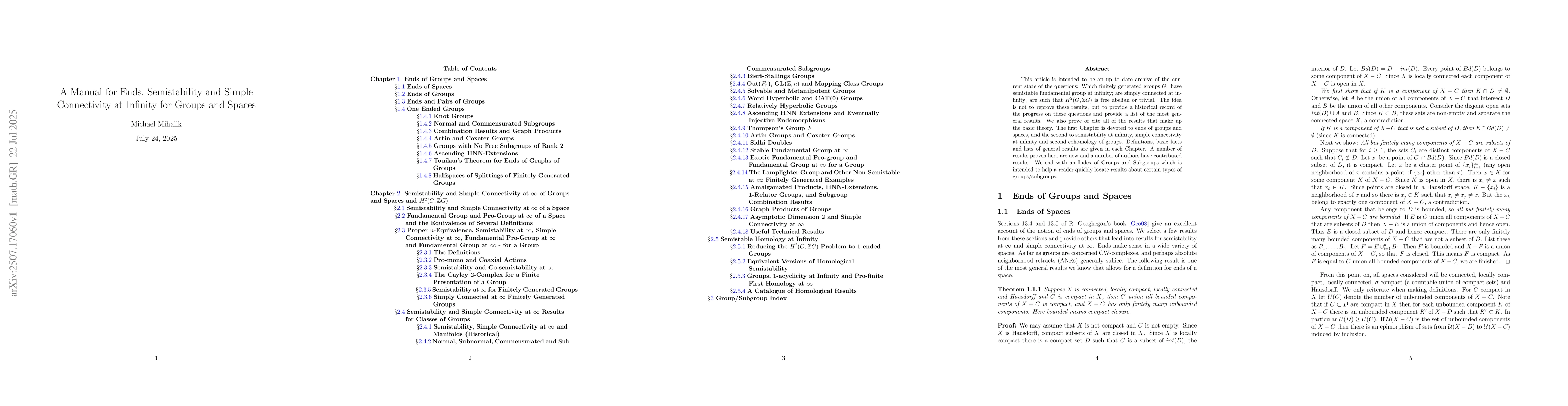 This article is intended to be an up to date archive of the current state of the questions: Which finitely generated groups $G$: have semistable fundamental group at infinity; are simply connected at infinity; are such that $H^2(G,\mathbb ZG)$ is free abelian or trivial. The idea is not to reprove these results, but to provide a historical record of the progress on these questions and provide a list of the most general results. We also prove or cite all of the results that make up the basic theory. The first Chapter is devoted to ends of groups and spaces, and the second to semistability at infinity, simple connectivity at infinity and second cohomology of groups. Definitions, basic facts and lists of general results are given in each Chapter. A number of results proven here are new and a number of authors have contributed results. We end with an Index of Groups and Subgroups which is intended to help a reader quickly locate results about certain types of groups/subgroups.