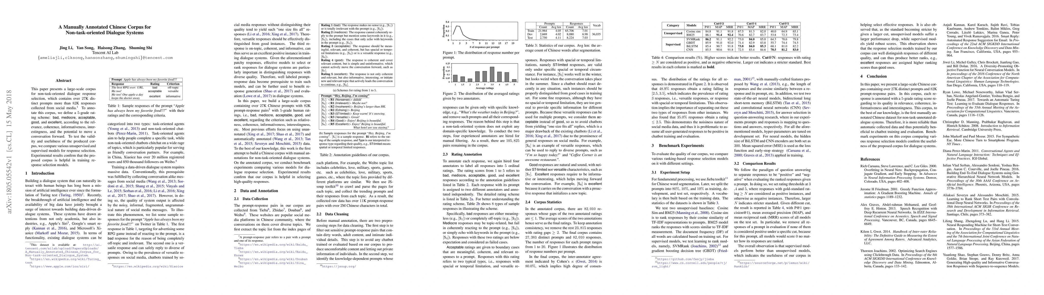 This paper introduces a manually annotated Chinese corpus for non-task-oriented dialogue response selection, featuring over 82K responses rated on a 5-grade scale. Experiments show that the corpus effectively aids in training response selection models.