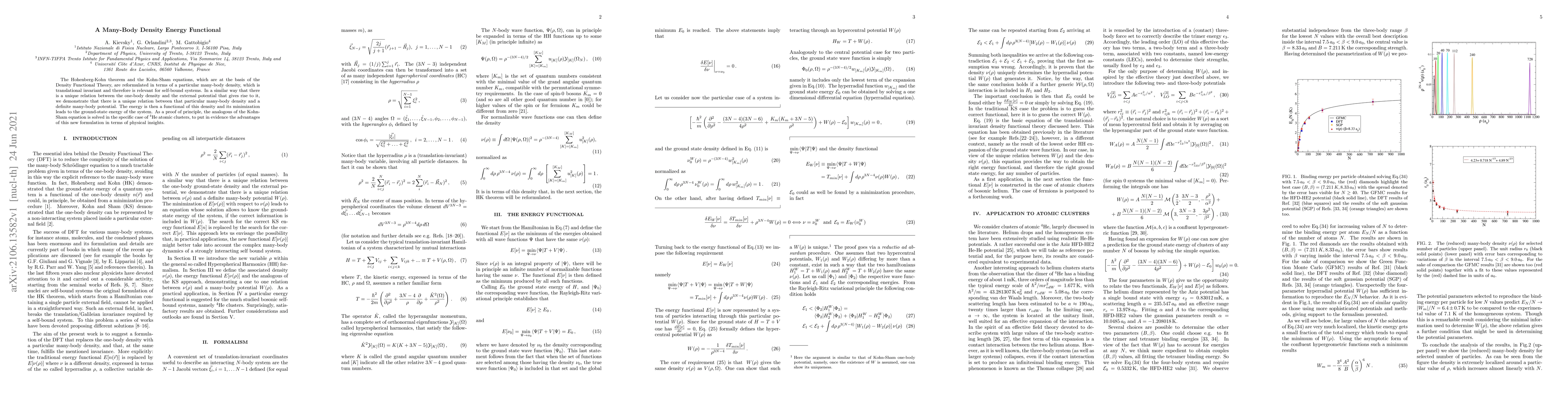 The Hohenberg-Kohn theorem and the Kohn-Sham equations, which are at the basis of the Density Functional Theory, are reformulated in terms of a particular many-body density, which is translational invariant and therefore is relevant for self-bound systems. In a similar way that there is a unique relation between the one-body density and the external potential that gives rise to it, we demonstrate that there is a unique relation between that particular many-body density and a definite many-body potential. The energy is then a functional of this density and its minimization leads to the ground-state energy of the system. As a proof of principle, the analogous of the Kohn-Sham equation is solved in the specific case of $^4$He atomic clusters, to put in evidence the advantages of this new formulation in terms of physical insights.