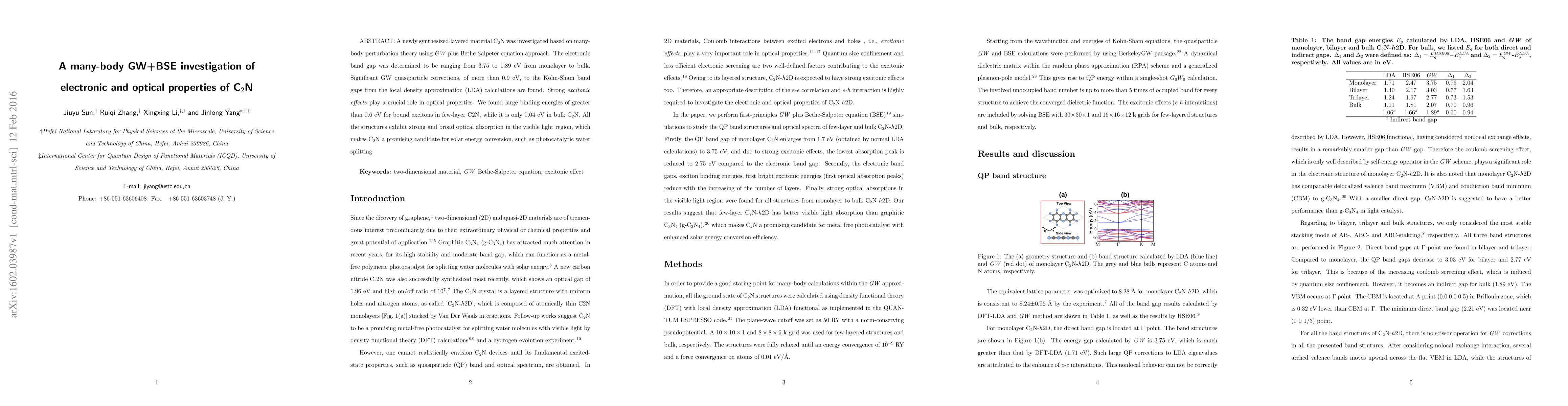 A newly synthesized layered material C2N was investigated based on many- body perturbation theory using GW plus Bethe-Salpeter equation approach. The electronic band gap was determined to be ranging from 3.75 to 1.89 eV from monolayer to bulk. Significant GW quasiparticle corrections, of more than 0.9 eV, to the Kohn-Sham band gaps from the local density approximation (LDA) calculations are found. Strong excitonic effects play a crucial role in optical properties. We found large binding energies of greater than 0.6 eV for bound excitons in few-layer C2N, while it is only 0.04 eV in bulk C2N. All the structures exhibit strong and broad optical absorption in the visible light region, which makes C2N a promising candidate for solar energy conversion, such as photocatalytic water splitting.