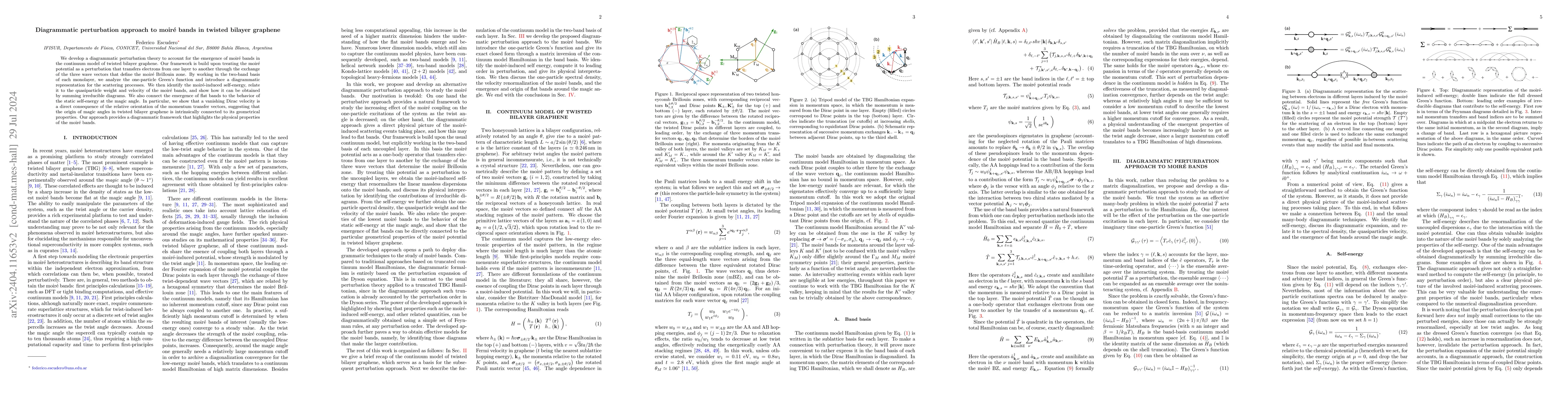 We develop a many-body perturbation theory to account for the emergence of moir\'e bands in the continuum model of twisted bilayer graphene. Our framework is build upon treating the moir\'e potential as a perturbation that transfers electrons from one layer to another through the exchange of the three wave vectors that define the moir\'e Brillouin zone. By working in the two-band basis of each monolayer, we analyze the one-particle Green's function and introduce a diagrammatic representation for the scattering processes. We then identify the moir\'e-induced self-energy, relate it to the quasiparticle weight and velocity of the moir\'e bands, and show how it can be obtained by summing irreducible diagrams. We also connect the emergence of flat bands to the behavior of the static self-energy at the magic angle. In particular, we show that a vanishing Dirac velocity is a direct consequence of the relative orientation of the momentum transfer vectors, suggesting that the origin of magic angles in twisted bilayer graphene is intrinsically connected to its geometrical properties. Our approach provides a many-body diagrammatic framework that highlights the physical properties of the moir\'e bands.