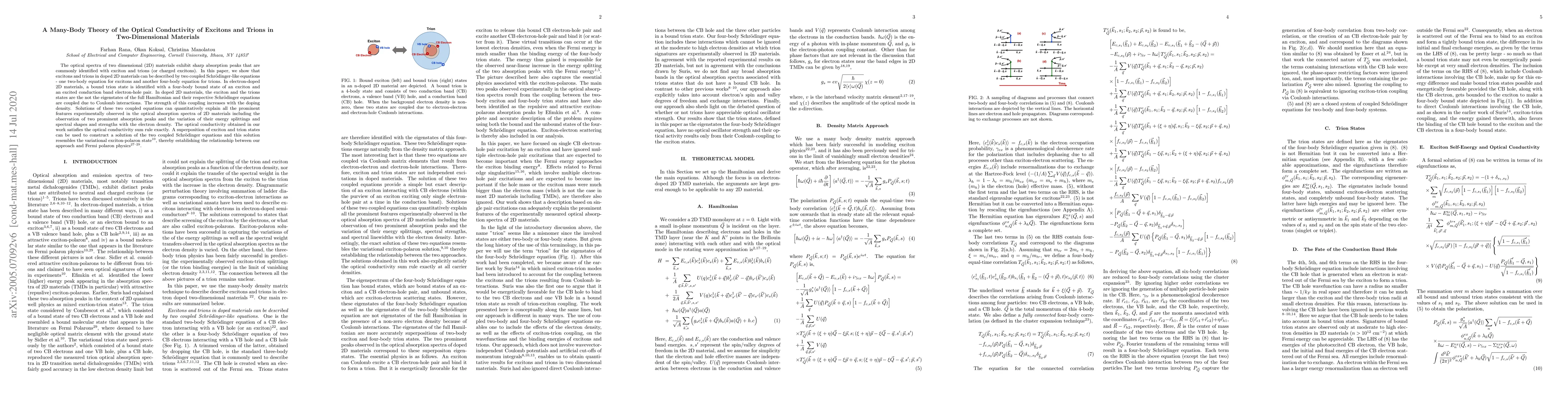 This paper develops a many-body theory for the optical conductivity of excitons and trions in 2D materials, showing that excitons and trions are described by coupled Schrödinger-like equations due to Coulomb interactions. The theory explains observed optical absorption features and establishes a connection to Fermi polaron physics.