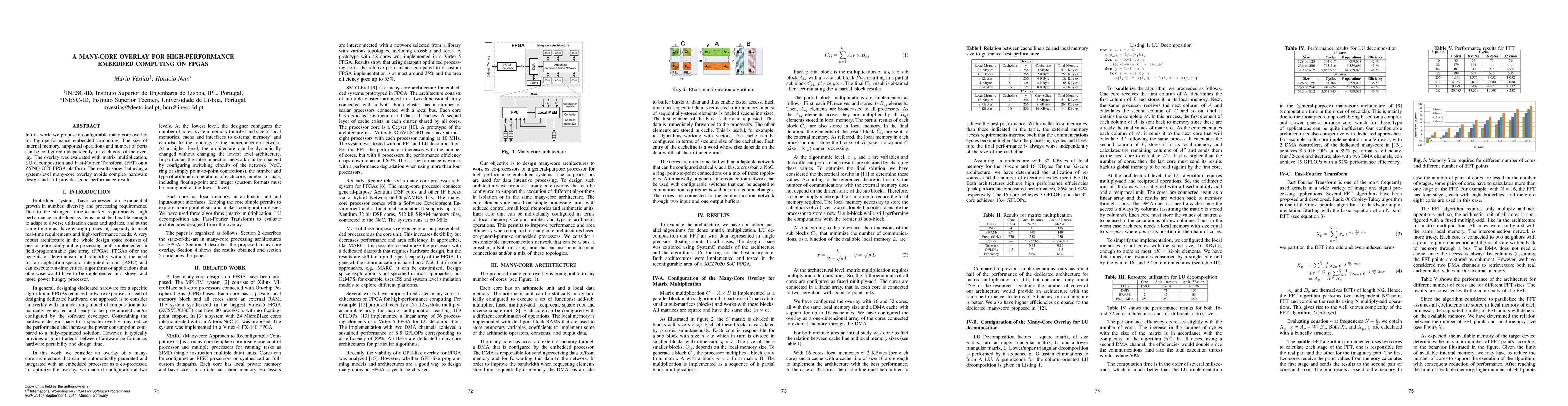 Summary: This research introduces a configurable many-core overlay for FPGA-based embedded computing, which allows independent configuration of memory, operations, and ports for each core. Evaluation on a ZYNQ-7020 FPGA demonstrates that this approach provides high performance while simplifying hardware design.