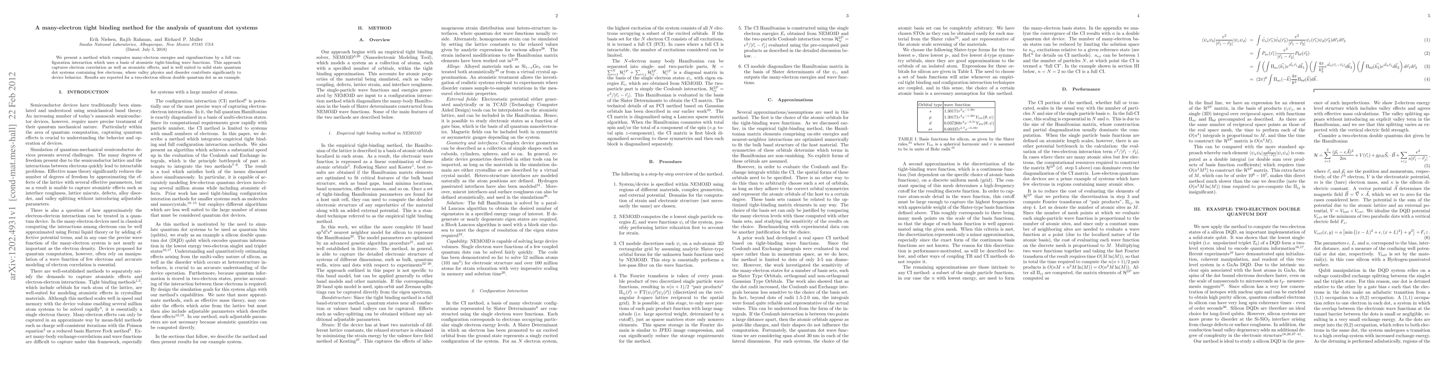 We present a method which computes many-electron energies and eigenfunctions by a full configuration interaction which uses a basis of atomistic tight-binding wave functions. This approach captures electron correlation as well as atomistic effects, and is well suited to solid state quantum dot systems containing few electrons, where valley physics and disorder contribute significantly to device behavior. Results are reported for a two-electron silicon double quantum dot as an example.