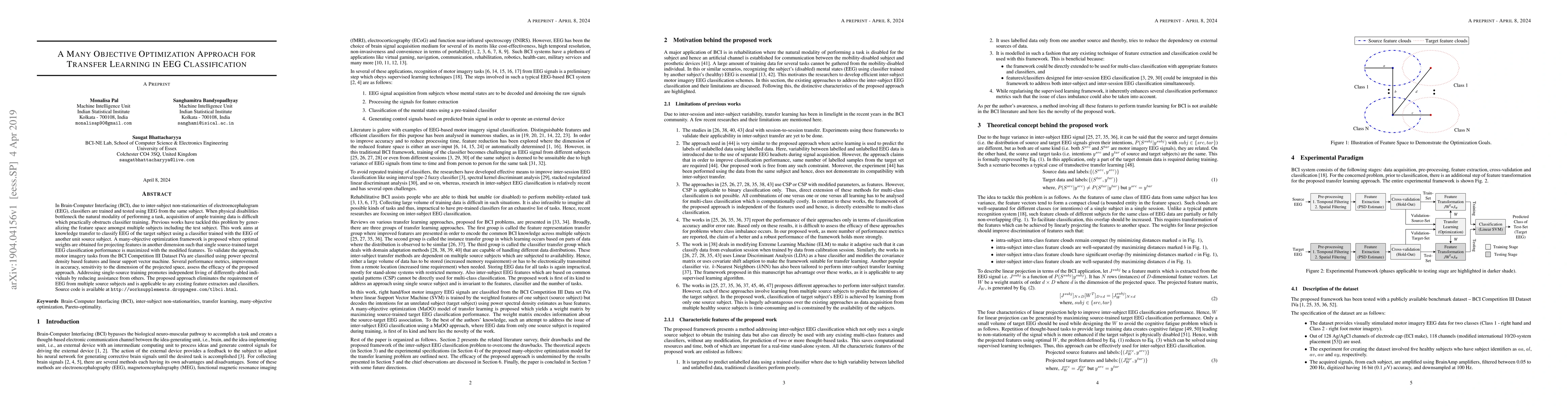In Brain-Computer Interfacing (BCI), due to inter-subject non-stationarities of electroencephalogram (EEG), classifiers are trained and tested using EEG from the same subject. When physical disabilities bottleneck the natural modality of performing a task, acquisition of ample training data is difficult which practically obstructs classifier training. Previous works have tackled this problem by generalizing the feature space amongst multiple subjects including the test subject. This work aims at knowledge transfer to classify EEG of the target subject using a classifier trained with the EEG of another unit source subject. A many-objective optimization framework is proposed where optimal weights are obtained for projecting features in another dimension such that single source-trained target EEG classification performance is maximized with the modified features. To validate the approach, motor imagery tasks from the BCI Competition III Dataset IVa are classified using power spectral density based features and linear support vector machine. Several performance metrics, improvement in accuracy, sensitivity to the dimension of the projected space, assess the efficacy of the proposed approach. Addressing single-source training promotes independent living of differently-abled individuals by reducing assistance from others. The proposed approach eliminates the requirement of EEG from multiple source subjects and is applicable to any existing feature extractors and classifiers. Source code is available at http://worksupplements.droppages.com/tlbci.html.