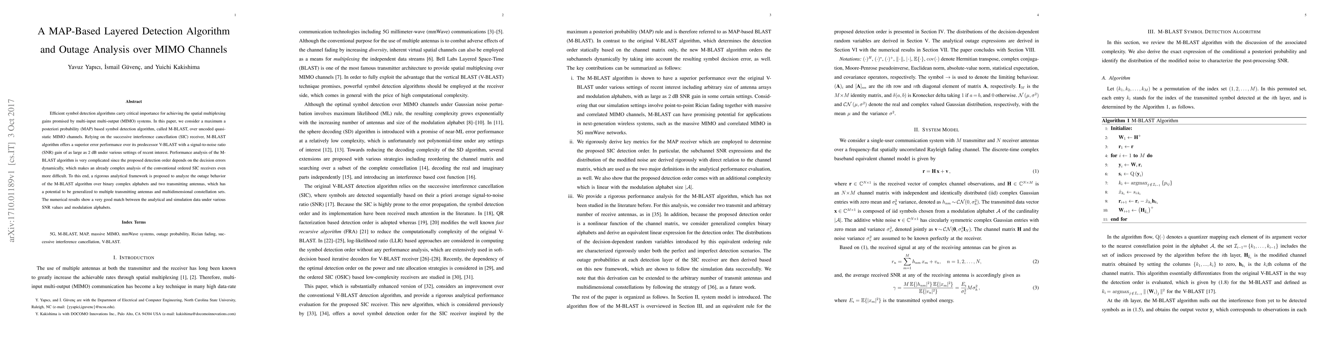 Efficient symbol detection algorithms carry critical importance for achieving the spatial multiplexing gains promised by multi-input multi-output (MIMO) systems. In this paper, we consider a maximum a posteriori probability (MAP) based symbol detection algorithm, called M-BLAST, over uncoded quasi-static MIMO channels. Relying on the successive interference cancellation (SIC) receiver, M-BLAST algorithm offers a superior error performance over its predecessor V-BLAST with a signal-to-noise ratio (SNR) gain of as large as 2 dB under various settings of recent interest. Performance analysis of the M-BLAST algorithm is very complicated since the proposed detection order depends on the decision errors dynamically, which makes an already complex analysis of the conventional ordered SIC receivers even more difficult. To this end, a rigorous analytical framework is proposed to analyze the outage behavior of the M-BLAST algorithm over binary complex alphabets and two transmitting antennas, which has a potential to be generalized to multiple transmitting antennas and multidimensional constellation sets. The numerical results show a very good match between the analytical and simulation data under various SNR values and modulation alphabets.
