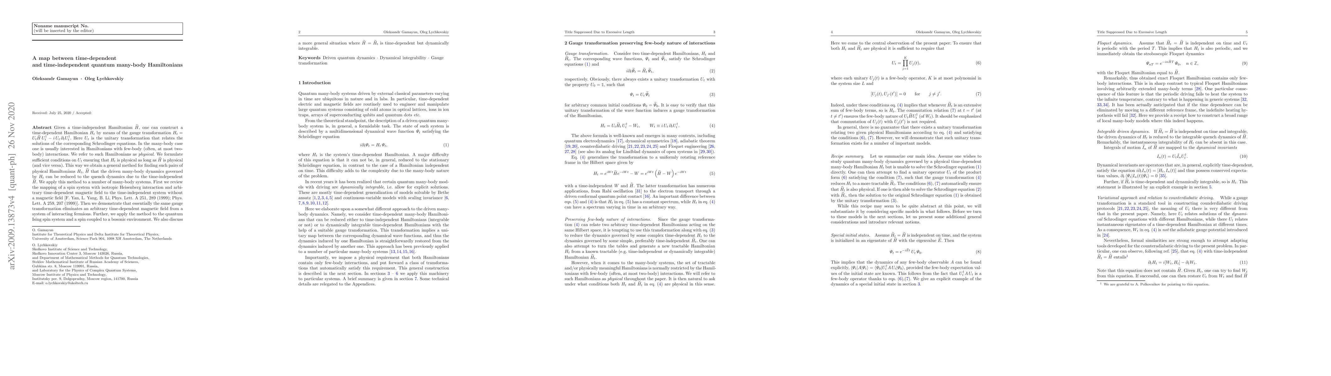 Given a time-independent Hamiltonian $\widetilde H$, one can construct a time-dependent Hamiltonian $H_t$ by means of the gauge transformation $H_t=U_t \widetilde H \, U^\dagger_t-i\, U_t\, \partial_t U_t^\dagger$. Here $U_t$ is the unitary transformation that relates the solutions of the corresponding Schrodinger equations. In the many-body case one is usually interested in Hamiltonians with few-body (often, at most two-body) interactions. We refer to such Hamiltonians as "physical". We formulate sufficient conditions on $U_t$ ensuring that $H_t$ is physical as long as $\widetilde H$ is physical (and vice versa). This way we obtain a general method for finding such pairs of physical Hamiltonians $H_t$, $\widetilde H$ that the driven many-body dynamics governed by $H_t$ can be reduced to the quench dynamics due to the time-independent $\widetilde H$. We apply this method to a number of many-body systems. First we review the mapping of a spin system with isotropic Heisenberg interaction and arbitrary time-dependent magnetic field to the time-independent system without a magnetic field [F. Yan, L. Yang, B. Li, Phys. Lett. A 251, 289 (1999); Phys. Lett. A 259, 207 (1999)]. Then we demonstrate that essentially the same gauge transformation eliminates an arbitrary time-dependent magnetic field from a system of interacting fermions. Further, we apply the method to the quantum Ising spin system and a spin coupled to a bosonic environment. We also discuss a more general situation where $\widetilde H = \widetilde H_t$ is time-dependent but dynamically integrable.