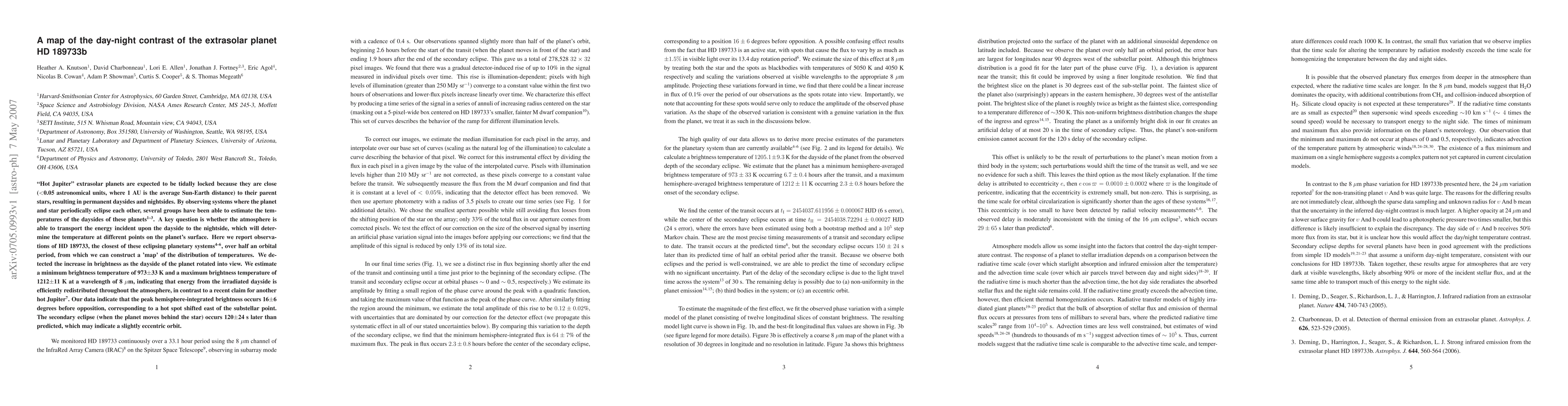 "Hot Jupiter" extrasolar planets are expected to be tidally locked because they are close (<0.05 astronomical units, where 1 AU is the average Sun-Earth distance) to their parent stars, resulting in permanent daysides and nightsides. By observing systems where the planet and star periodically eclipse each other, several groups have been able to estimate the temperatures of the daysides of these planets. A key question is whether the atmosphere is able to transport the energy incident upon the dayside to the nightside, which will determine the temperature at different points on the planet's surface. Here we report observations of HD 189733, the closest of these eclipsing planetary systems, over half an orbital period, from which we can construct a 'map' of the distribution of temperatures. We detected the increase in brightness as the dayside of the planet rotated into view. We estimate a minimum brightness temperature of 973 +/- 33 K and a maximum brightness temperature of 1212 +/- 11 K at a wavelength of 8 microns, indicating that energy from the irradiated dayside is efficiently redistributed throughout the atmosphere, in contrast to a recent claim for another hot Jupiter. Our data indicate that the peak hemisphere-integrated brightness occurs 16$\pm$6 degrees before opposition, corresponding to a hot spot shifted east of the substellar point. The secondary eclipse (when the planet moves behind the star) occurs 120 +/- 24 s later than predicted, which may indicate a slightly eccentric orbit.