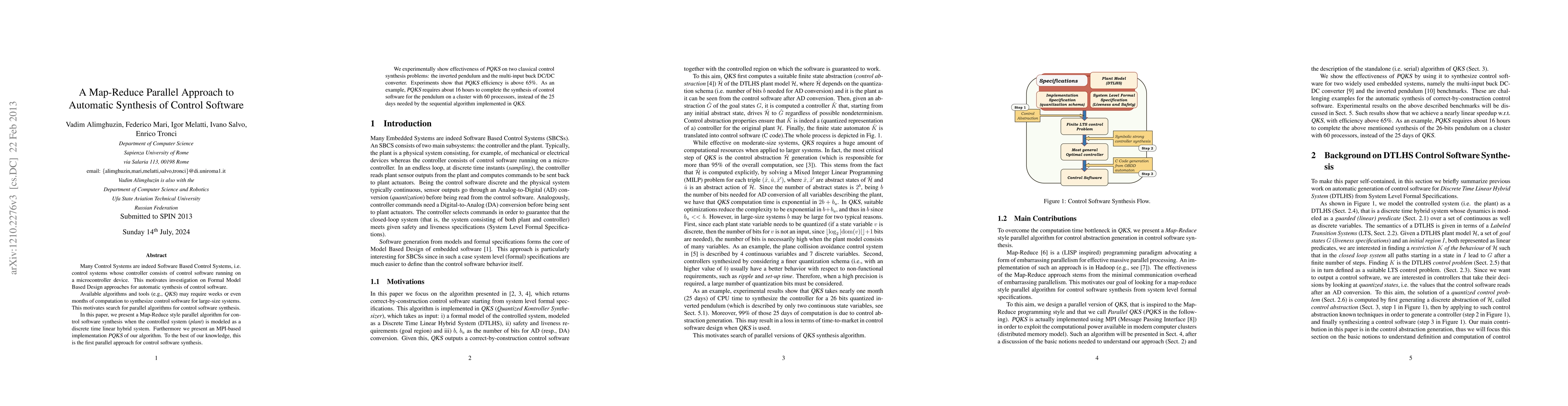 Many Control Systems are indeed Software Based Control Systems, i.e. control systems whose controller consists of control software running on a microcontroller device. This motivates investigation on Formal Model Based Design approaches for automatic synthesis of control software. Available algorithms and tools (e.g., QKS) may require weeks or even months of computation to synthesize control software for large-size systems. This motivates search for parallel algorithms for control software synthesis. In this paper, we present a Map-Reduce style parallel algorithm for control software synthesis when the controlled system (plant) is modeled as discrete time linear hybrid system. Furthermore we present an MPI-based implementation PQKS of our algorithm. To the best of our knowledge, this is the first parallel approach for control software synthesis. We experimentally show effectiveness of PQKS on two classical control synthesis problems: the inverted pendulum and the multi-input buck DC/DC converter. Experiments show that PQKS efficiency is above 65%. As an example, PQKS requires about 16 hours to complete the synthesis of control software for the pendulum on a cluster with 60 processors, instead of the 25 days needed by the sequential algorithm in QKS.