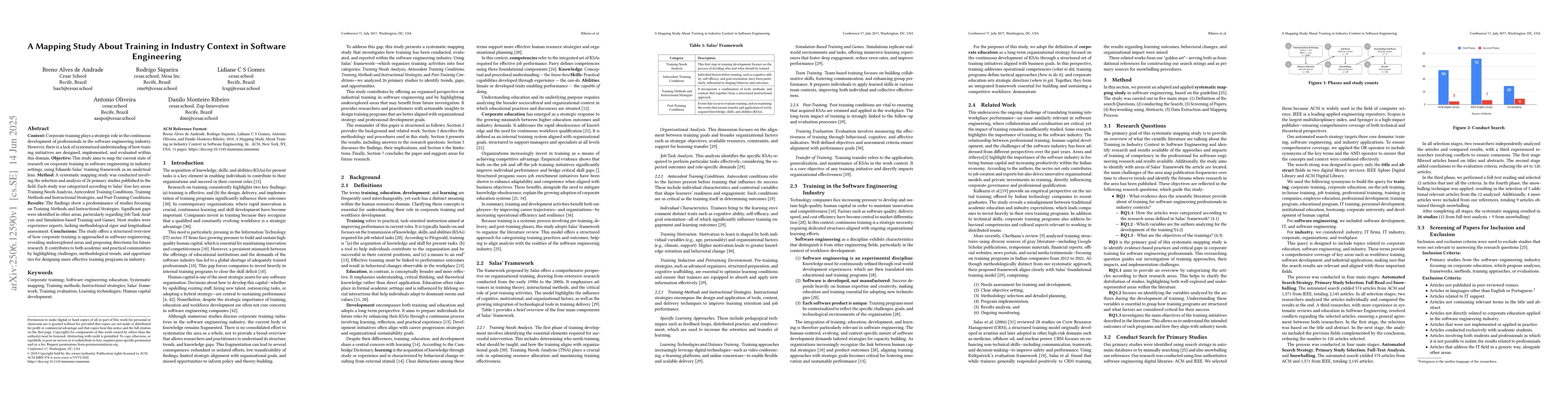 This mapping study examines corporate training in software engineering, revealing a focus on Training Methods and Instructional Strategies. It identifies gaps in areas like Job/Task Analysis and Simulation-based Training, suggesting opportunities for future research to design more effective industry training programs.