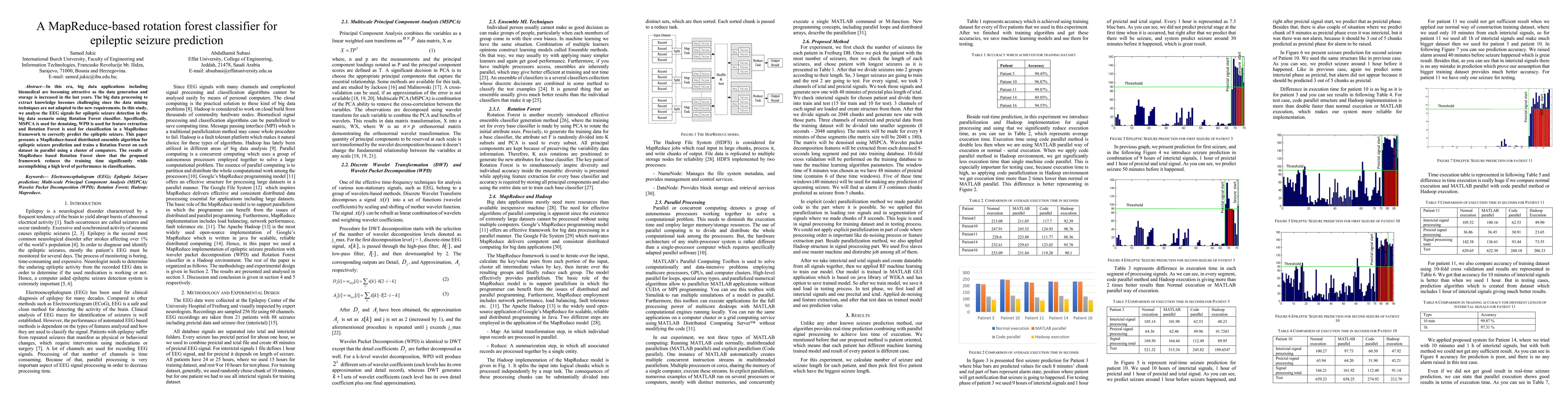 This paper proposes a MapReduce-based rotation forest classifier for predicting epileptic seizures using EEG signals. It employs MSPCA for denoising, WPD for feature extraction, and a distributed ensemble algorithm to achieve high performance and reduce training time.
