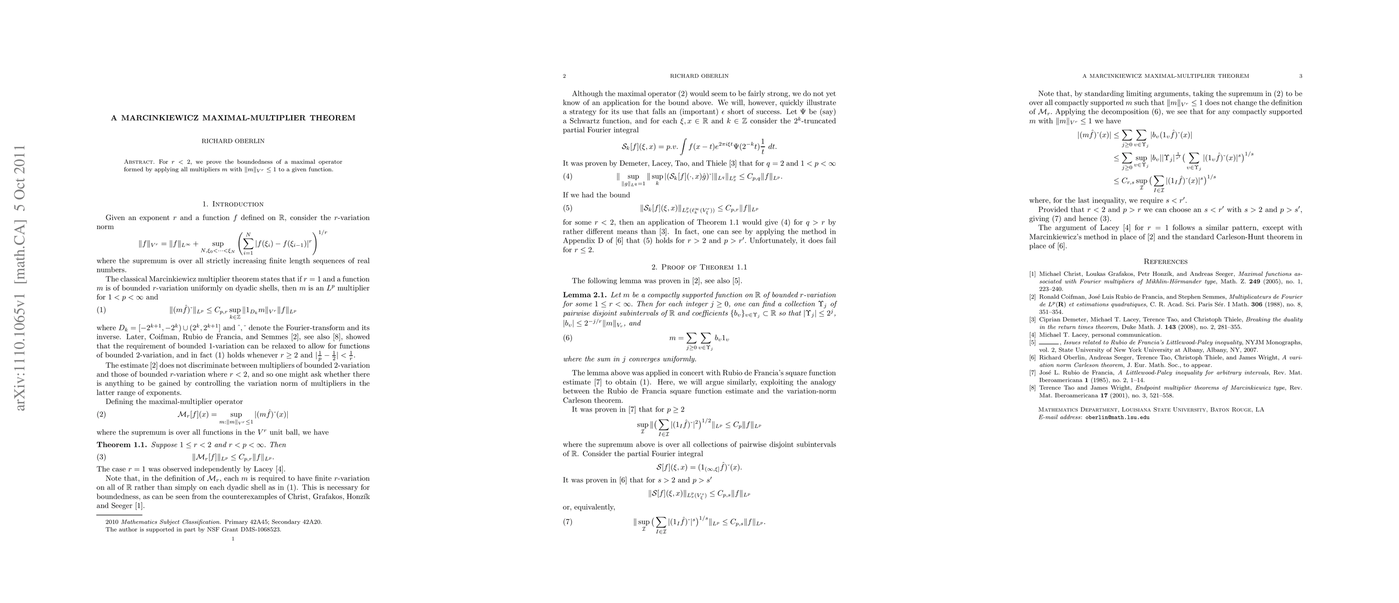 The paper proves the boundedness of a maximal operator formed by applying multipliers with norm ≤ 1 in Vr space to a given function, for r < 2.