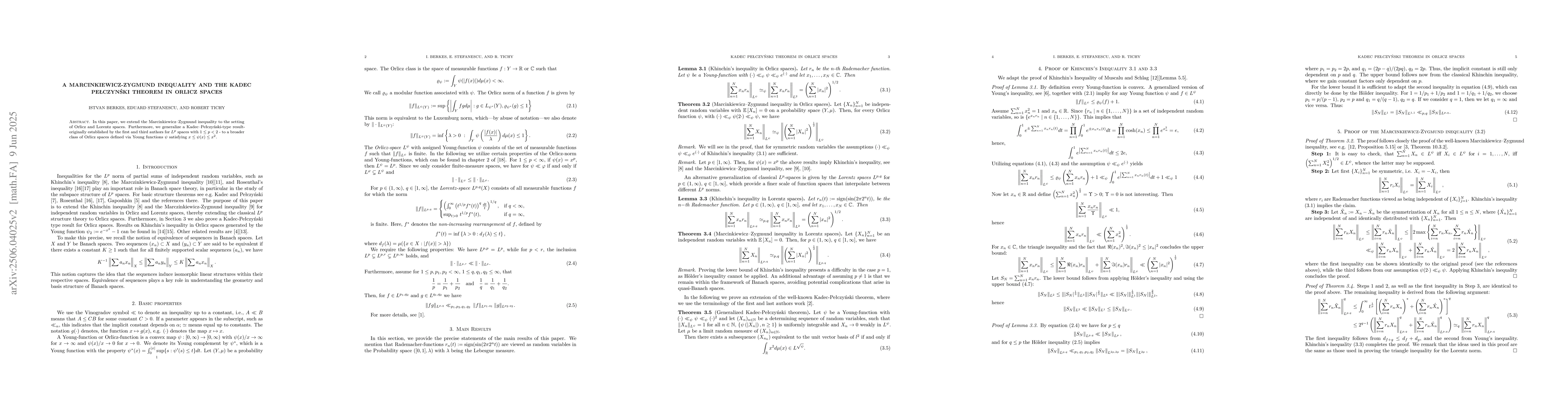 The introduction of a Marcinkiewicz-Zygmund inequality in Orlicz and Lorentz spaces, along with a generalized Kadec--Pełczynśki theorem.