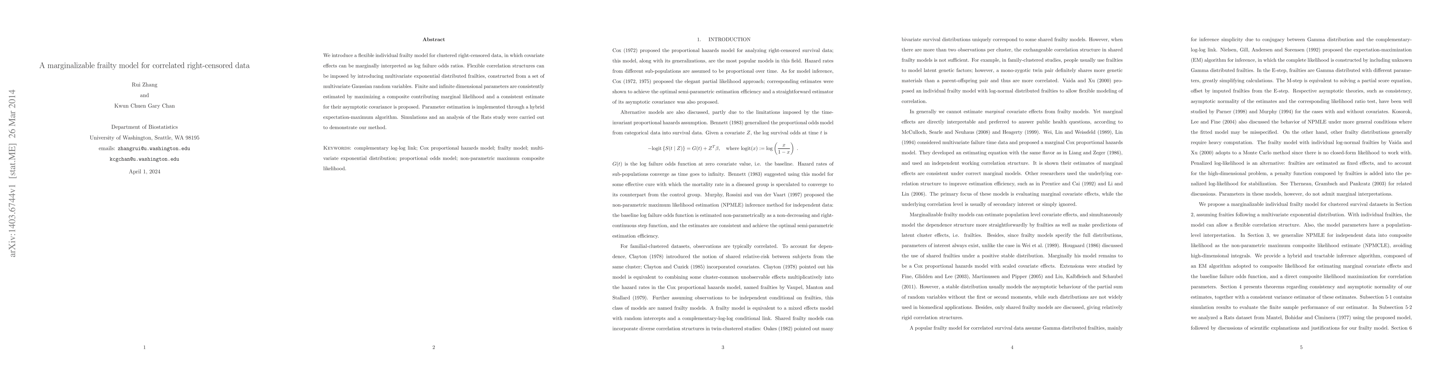 We introduce a flexible individual frailty model for clustered right-censored data, in which covariate effects can be marginally interpreted as log failure odds ratios. Flexible correlation structures can be imposed by introducing multivariate exponential distributed frailties, constructed from a set of multivariate Gaussian random variables. Finite and infinite dimensional parameters are consistently estimated by maximizing a composite contributing marginal likelihood and a consistent estimate for their asymptotic covariance is proposed. Parameter estimation is implemented through a hybrid expectation-maximum algorithm. Simulations and an analysis of the Rats study were carried out to demonstrate our method.