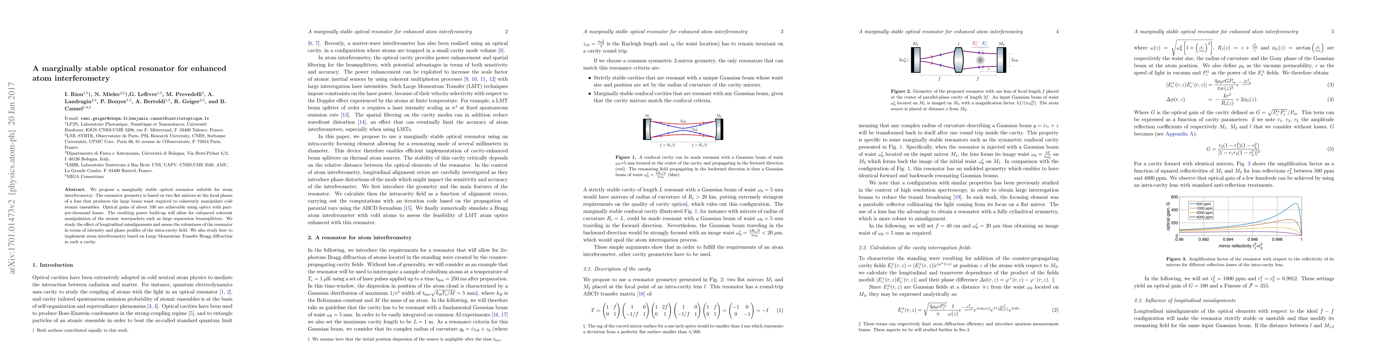 This paper proposes a marginally stable optical resonator for improved atom interferometry, utilizing two flat mirrors at lens focal planes to achieve high optical gains and large beam waists. The study assesses the resonator's robustness against misalignments and explores its application in Large Momentum Transfer Bragg diffraction for enhanced atomic manipulation.