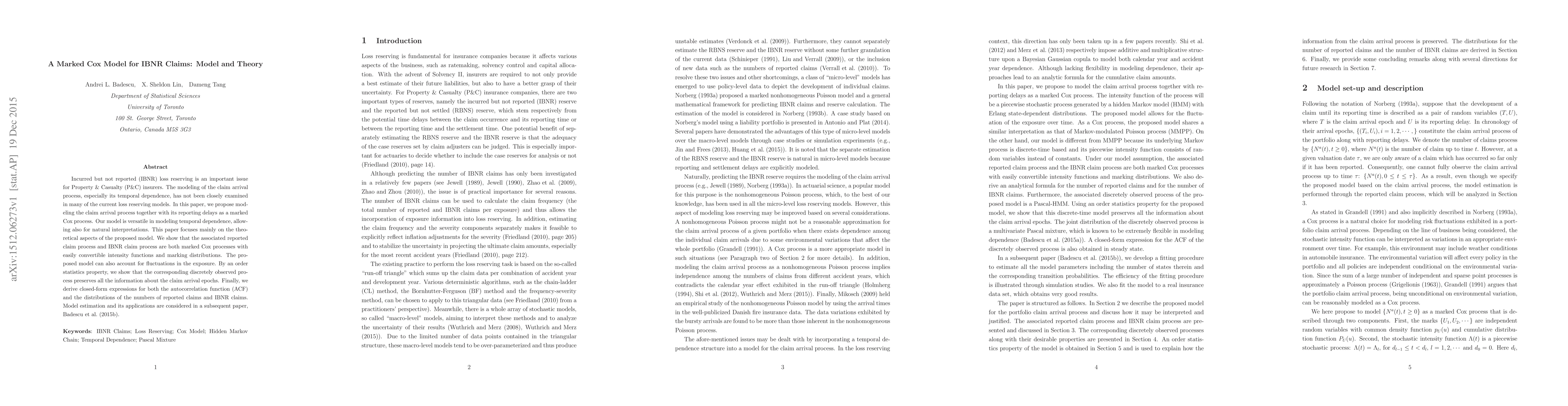 Incurred but not reported (IBNR) loss reserving is an important issue for Property & Casualty (P&C) insurers. The modeling of the claim arrival process, especially its temporal dependence, has not been closely examined in many of the current loss reserving models. In this paper, we propose modeling the claim arrival process together with its reporting delays as a marked Cox process. Our model is versatile in modeling temporal dependence, allowing also for natural interpretations. This paper focuses mainly on the theoretical aspects of the proposed model. We show that the associated reported claim process and IBNR claim process are both marked Cox processes with easily convertible intensity functions and marking distributions. The proposed model can also account for fluctuations in the exposure. By an order statistics property, we show that the corresponding discretely observed process preserves all the information about the claim arrival epochs. Finally, we derive closed-form expressions for both the autocorrelation function (ACF) and the distributions of the numbers of reported claims and IBNR claims. Model estimation and its applications are considered in a subsequent paper, Badescu et al.(2015b)