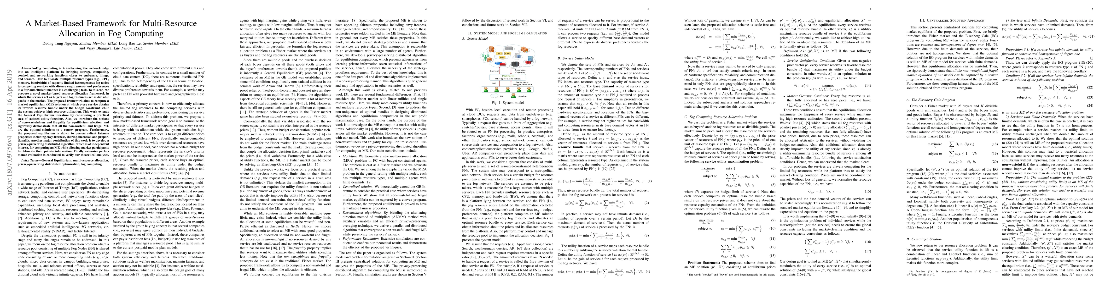 This paper proposes a market-based framework for efficient and fair allocation of multiple resources in fog computing, where services act as buyers and fog resources as goods. The framework computes a market equilibrium that maximizes resource utilization while ensuring fairness properties like envy-freeness and proportionality, and includes a privacy-preserving distributed algorithm for computation.