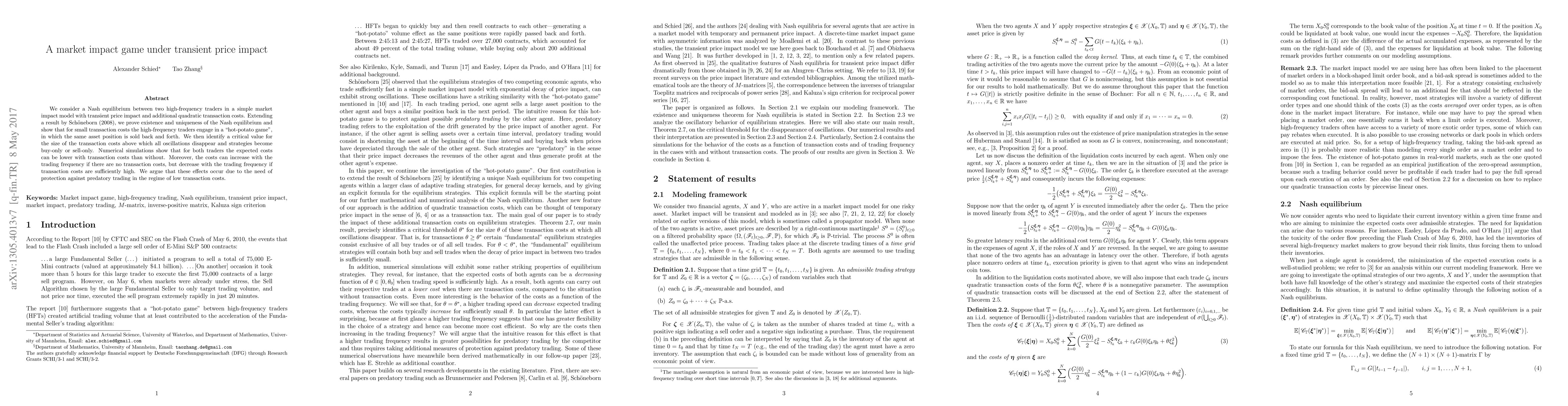 This paper examines a market impact game between two high-frequency traders under transient price impact and quadratic transaction costs, proving the existence and uniqueness of a Nash equilibrium. It finds that low transaction costs lead to a "hot-potato game," while high transaction costs result in buy-only or sell-only strategies, with numerical simulations indicating lower expected costs for traders with sufficient transaction costs.