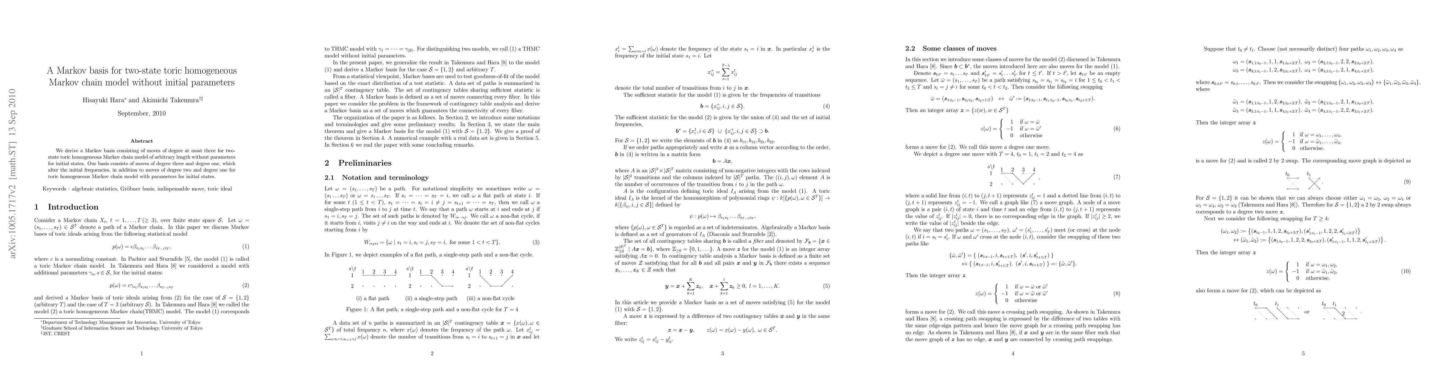 Summary: This paper develops a Markov basis for a two-state toric homogeneous Markov chain model, comprising moves of degrees up to three, specifically focusing on models without initial parameters, and introduces a set of degree three and one moves to alter initial frequencies.