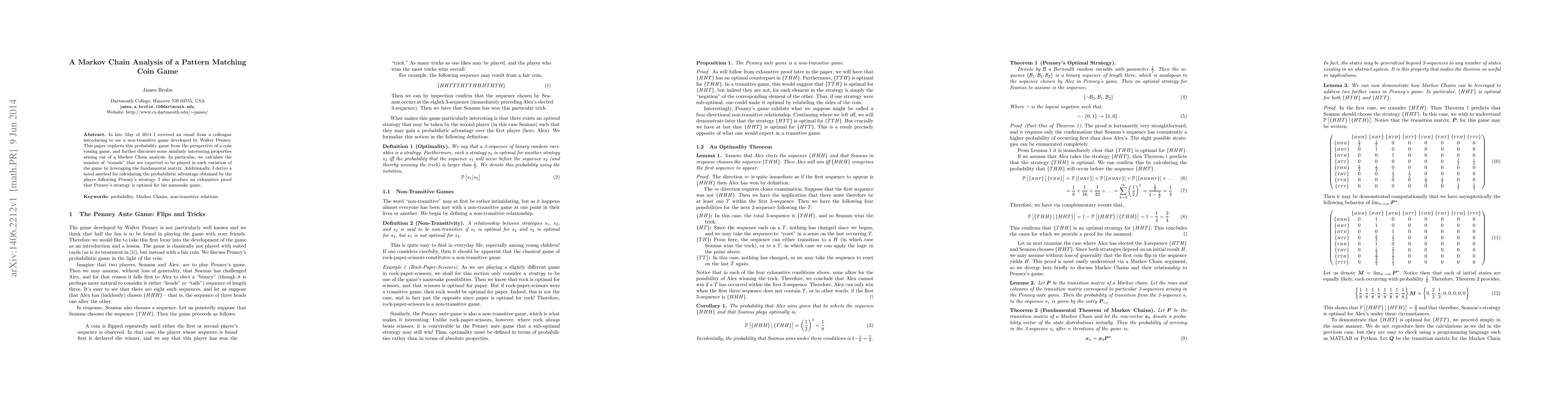 In late May of 2014 I received an email from a colleague introducing to me a non-transitive game developed by Walter Penney. This paper explores this probability game from the perspective of a coin tossing game, and further discusses some similarly interesting properties arising out of a Markov Chain analysis. In particular, we calculate the number of "rounds" that are expected to be played in each variation of the game by leveraging the fundamental matrix. Additionally, I derive a novel method for calculating the probabilistic advantage obtained by the player following Penney's strategy. I also produce an exhaustive proof that Penney's strategy is optimal for his namesake game.