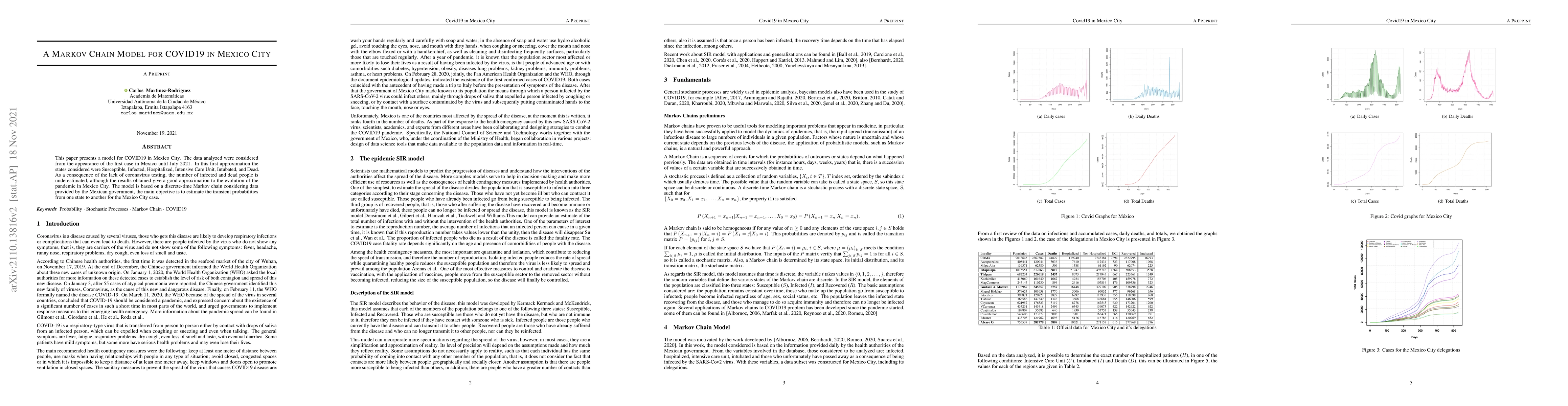 A Markov Chain Model is presented to analyze COVID-19 in Mexico City from 2020 to 2021, estimating transient probabilities between states like Susceptible, Infected, and Dead.