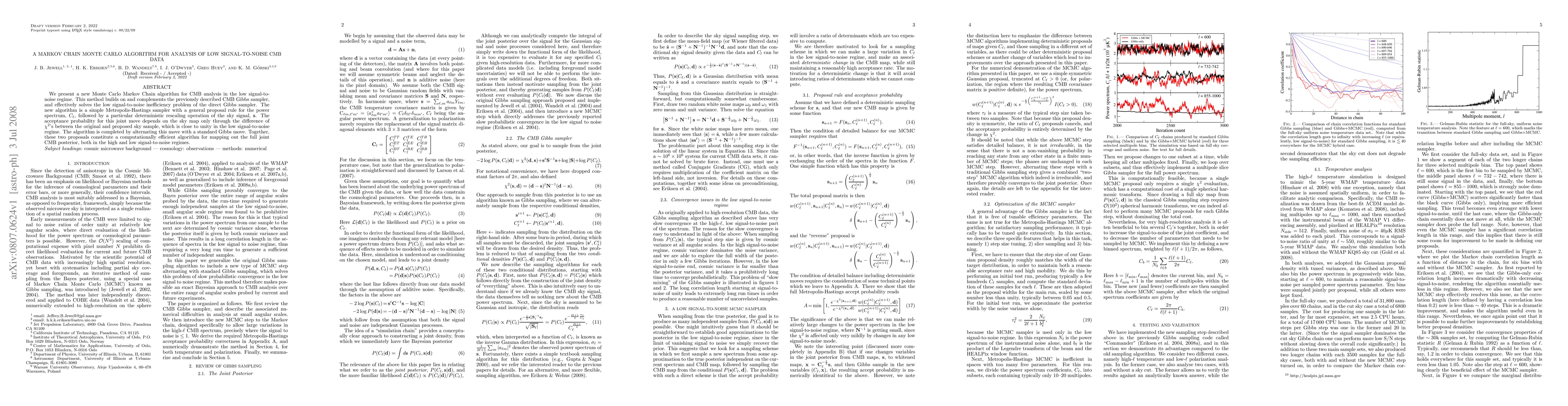 The paper introduces a new Markov Chain Monte Carlo (MCMC) algorithm, combining a Metropolis-Hastings sampler with a Gibbs sampler, to efficiently analyze low signal-to-noise Cosmic Microwave Background (CMB) data. This hybrid approach resolves inefficiencies in direct Gibbs sampling for such data, enabling effective mapping of the full CMB posterior.