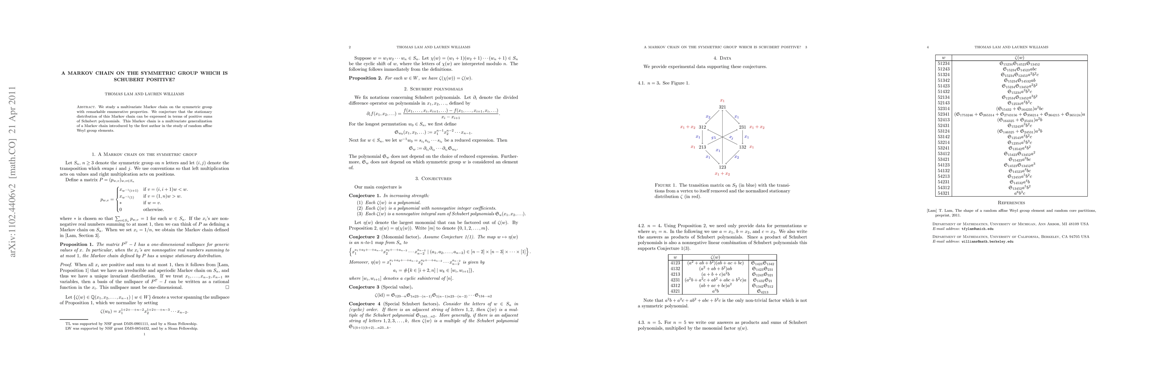 Summary: The paper explores a multivariate Markov chain on the symmetric group with unique enumerative properties, proposing that its stationary distribution can be represented using positive sums of Schubert polynomials, extending a previous Markov chain studied by the first author.