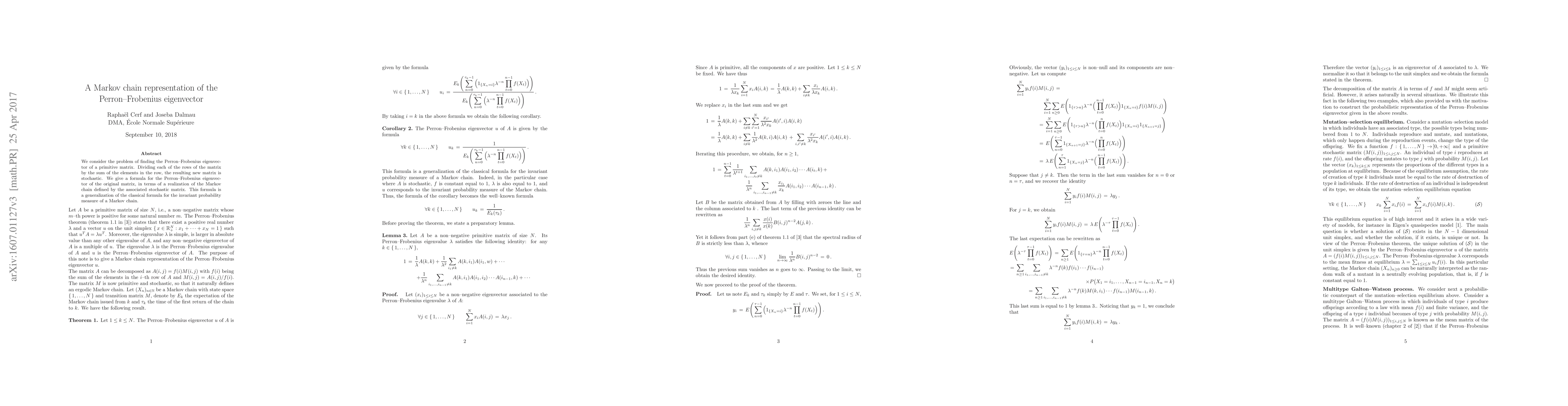 This paper presents a Markov chain representation for finding the Perron-Frobenius eigenvector of a primitive matrix by transforming it into a stochastic matrix, providing a formula that generalizes the classical invariant probability measure of a Markov chain.